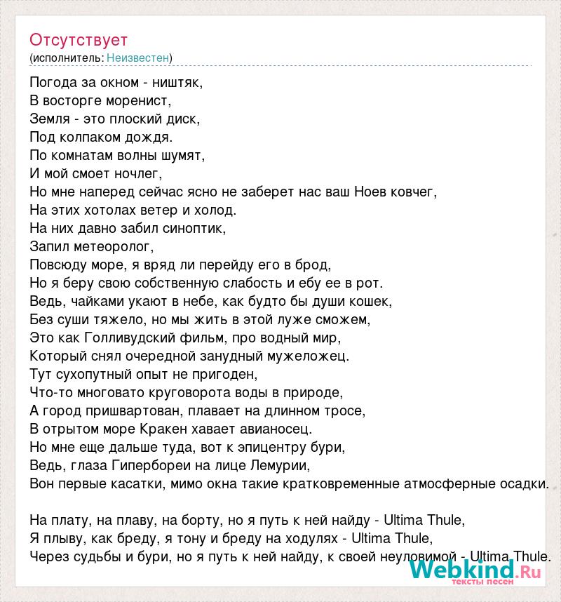 Погода за окном - ништяк, В восторге моренист, Земля - это плоский диск, Под колпаком дождя. По комнатам волны шумят, И мой смоет ночлег, Но мне наперед сейчас ясно не заберет нас ваш Ноев ковчег, На этих хотолах ветер и холод. На них давно забил синоптик, Запил метеоролог, Повсюду море, я вряд ли перейду его в брод, Но я беру свою собственную слабость и ебу ее в рот. Ведь, чайками укают в небе, как будто бы души кошек, Без суши тяжело, но мы жить в этой луже сможем, Это как Голливудский фильм, про водный мир, Который снял очередной занудный мужеложец. Тут сухопутный опыт не пригоден, Что-то многовато круговорота воды в природе, А город пришвартован, плавает на длинном тросе, В отрытом море Кракен хавает авианосец. Но мне еще дальше туда, вот к эпицентру бури, Ведь, глаза Гипербореи на лице Лемурии, Вон первые касатки, мимо окна такие кратковременные атмосферные осадки. На плату, на плаву, на борту, но я путь к ней найду - Ultima Thule, Я плыву, как бреду, я тону и бреду на ходулях - Ultima Thule, Через судьбы и бури, но я путь к ней найду, к своей неуловимой - Ultima Thule.