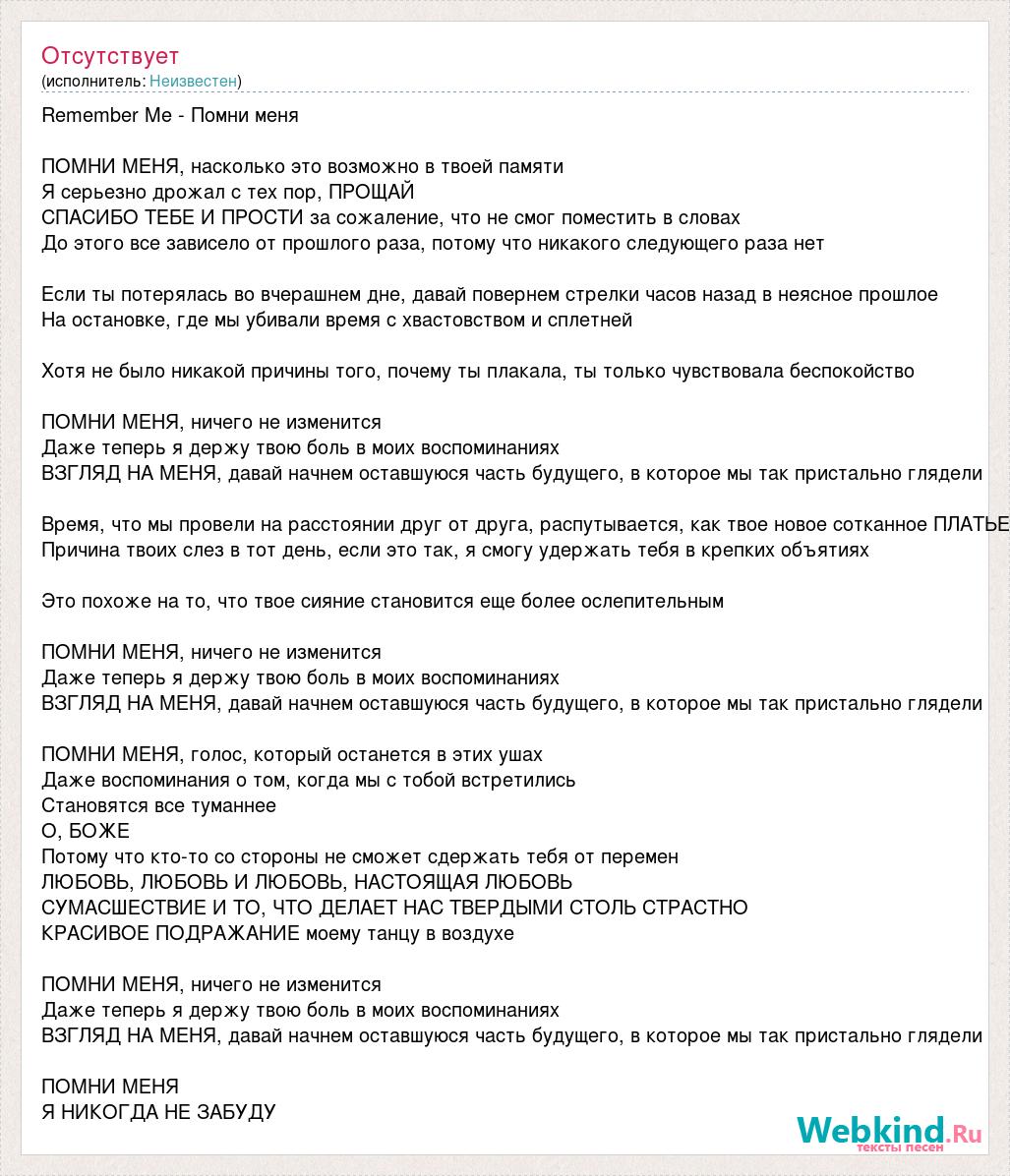 Remember Me - Помни меня ПОМНИ МЕНЯ, насколько это возможно в твоей памяти Я серьезно дрожал с тех пор, ПРОЩАЙ СПАСИБО ТЕБЕ И ПРОСТИ за сожаление, что не смог поместить в словах До этого все зависело от прошлого раза, потому что никакого следующего раза нет Если ты потерялась во вчерашнем дне, давай повернем стрелки часов назад в неясное прошлое На остановке, где мы убивали время с хвастовством и сплетней Хотя не было никакой причины того, почему ты плакала, ты только чувствовала беспокойство ПОМНИ МЕНЯ, ничего не изменится Даже теперь я держу твою боль в моих воспоминаниях ВЗГЛЯД НА МЕНЯ, давай начнем оставшуюся часть будущего, в которое мы так пристально глядели Время, что мы провели на расстоянии друг от друга, распутывается, как твое новое сотканное ПЛАТЬЕ Причина твоих слез в тот день, если это так, я смогу удержать тебя в крепких объятиях Это похоже на то, что твое сияние становится еще более ослепительным ПОМНИ МЕНЯ, ничего не изменится Даже теперь я держу твою боль в моих воспоминаниях ВЗГЛЯД НА МЕНЯ, давай начнем оставшуюся часть будущего, в которое мы так пристально глядели ПОМНИ МЕНЯ, голос, который останется в этих ушах Даже воспоминания о том, когда мы с тобой встретились Становятся все туманнее О, БОЖЕ Потому что кто-то со стороны не сможет сдержать тебя от перемен ЛЮБОВЬ, ЛЮБОВЬ И ЛЮБОВЬ, НАСТОЯЩАЯ ЛЮБОВЬ СУМАСШЕСТВИЕ И ТО, ЧТО ДЕЛАЕТ НАС ТВЕРДЫМИ СТОЛЬ СТРАСТНО КРАСИВОЕ ПОДРАЖАНИЕ моему танцу в воздухе ПОМНИ МЕНЯ, ничего не изменится Даже теперь я держу твою боль в моих воспоминаниях ВЗГЛЯД НА МЕНЯ, давай начнем оставшуюся часть будущего, в которое мы так пристально глядели ПОМНИ МЕНЯ Я НИКОГДА НЕ ЗАБУДУ