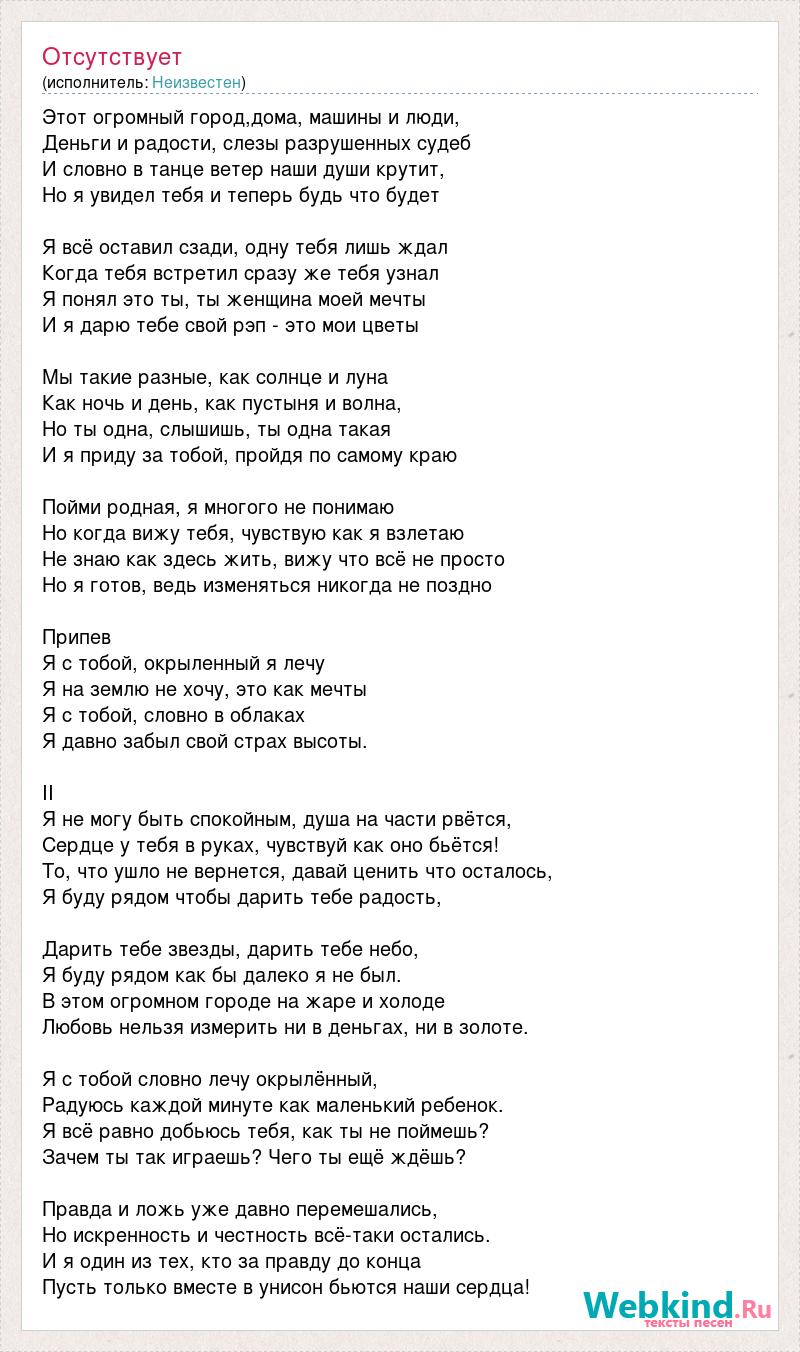 Этот огромный город,дома, машины и люди, Деньги и радости, слезы разрушенных судеб И словно в танце ветер наши души крутит, Но я увидел тебя и теперь будь что будет Я всё оставил сзади, одну тебя лишь ждал Когда тебя встретил сразу же тебя узнал Я понял это ты, ты женщина моей мечты И я дарю тебе свой рэп - это мои цветы Мы такие разные, как солнце и луна Как ночь и день, как пустыня и волна, Но ты одна, слышишь, ты одна такая И я приду за тобой, пройдя по самому краю Пойми родная, я многого не понимаю Но когда вижу тебя, чувствую как я взлетаю Не знаю как здесь жить, вижу что всё не просто Но я готов, ведь изменяться никогда не поздно Припев Я с тобой, окрыленный я лечу Я на землю не хочу, это как мечты Я с тобой, словно в облаках Я давно забыл свой страх высоты. II Я не могу быть спокойным, душа на части рвётся, Сердце у тебя в руках, чувствуй как оно бьётся! То, что ушло не вернется, давай ценить что осталось, Я буду рядом чтобы дарить тебе радость, Дарить тебе звезды, дарить тебе небо, Я буду рядом как бы далеко я не был. В этом огромном городе на жаре и холоде Любовь нельзя измерить ни в деньгах, ни в золоте. Я с тобой словно лечу окрылённый, Радуюсь каждой минуте как маленький ребенок. Я всё равно добьюсь тебя, как ты не поймешь? Зачем ты так играешь? Чего ты ещё ждёшь? Правда и ложь уже давно перемешались, Но искренность и честность всё-таки остались. И я один из тех, кто за правду до конца Пусть только вместе в унисон бьются наши сердца!
