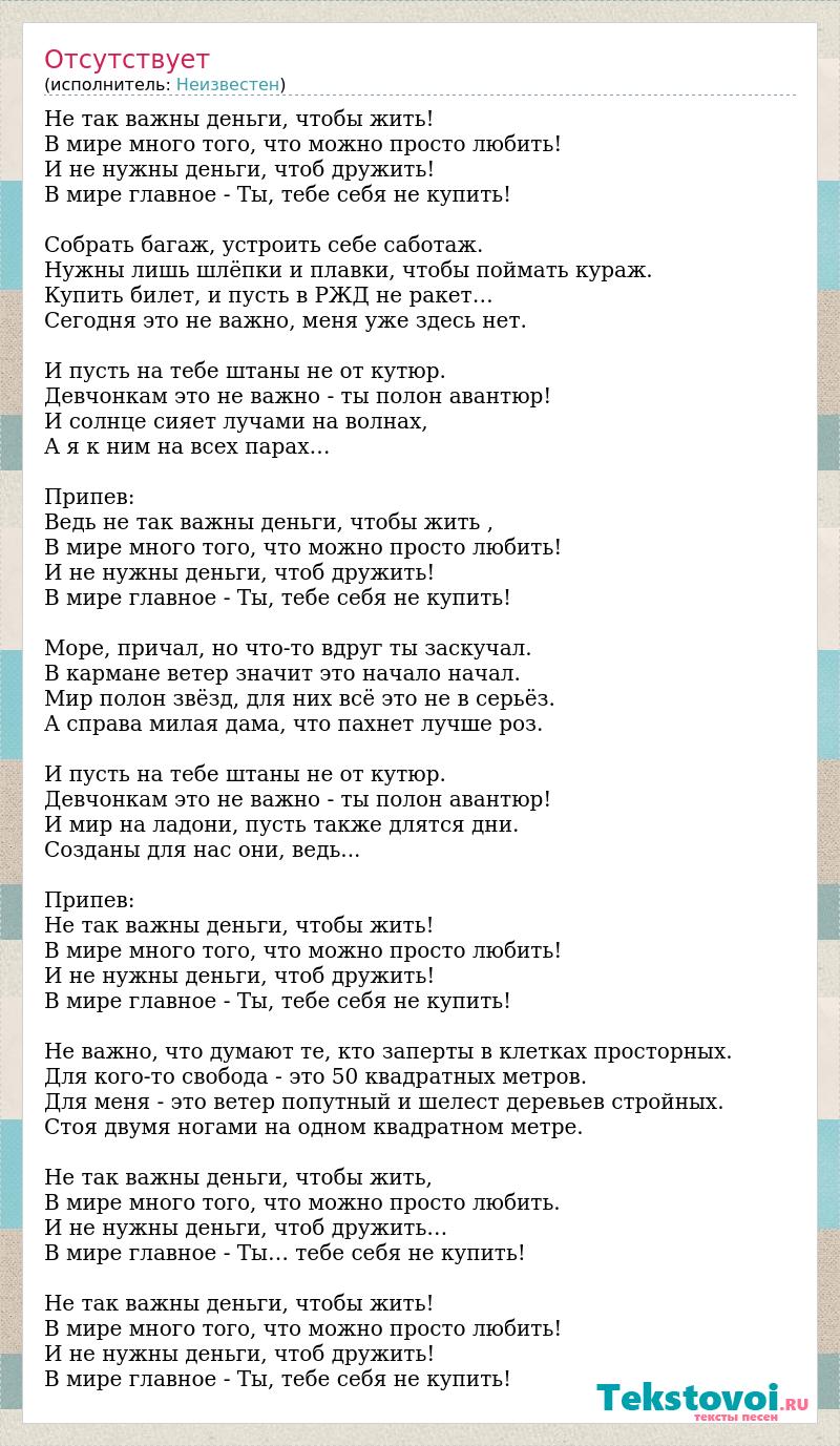 Не так важны деньги, чтобы жить! В мире много того, что можно просто любить! И не нужны деньги, чтоб дружить! В мире главное - Ты, тебе себя не купить! Собрать багаж, устроить себе саботаж. Нужны лишь шлёпки и плавки, чтобы поймать кураж. Купить билет, и пусть в РЖД не ракет… Сегодня это не важно, меня уже здесь нет. И пусть на тебе штаны не от кутюр. Девчонкам это не важно - ты полон авантюр! И солнце сияет лучами на волнах, А я к ним на всех парах… Припев: Ведь не так важны деньги, чтобы жить , В мире много того, что можно просто любить! И не нужны деньги, чтоб дружить! В мире главное - Ты, тебе себя не купить! Море, причал, но что-то вдруг ты заскучал. В кармане ветер значит это начало начал. Мир полон звёзд, для них всё это не в серьёз. А справа милая дама, что пахнет лучше роз. И пусть на тебе штаны не от кутюр. Девчонкам это не важно - ты полон авантюр! И мир на ладони, пусть также длятся дни. Созданы для нас они, ведь... Припев: Не так важны деньги, чтобы жить! В мире много того, что можно просто любить! И не нужны деньги, чтоб дружить! В мире главное - Ты, тебе себя не купить! Не важно, что думают те, кто заперты в клетках просторных. Для кого-то свобода - это 50 квадратных метров. Для меня - это ветер попутный и шелест деревьев стройных. Стоя двумя ногами на одном квадратном метре. Не так важны деньги, чтобы жить, В мире много того, что можно просто любить. И не нужны деньги, чтоб дружить… В мире главное - Ты… тебе себя не купить! Не так важны деньги, чтобы жить! В мире много того, что можно просто любить! И не нужны деньги, чтоб дружить! В мире главное - Ты, тебе себя не купить!