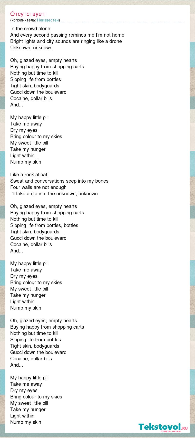 In the crowd alone And every second passing reminds me I’m not home Bright lights and city sounds are ringing like a drone Unknown, unknown Oh, glazed eyes, empty hearts Buying happy from shopping carts Nothing but time to kill Sipping life from bottles Tight skin, bodyguards Gucci down the boulevard Cocaine, dollar bills And... My happy little pill Take me away Dry my eyes Bring colour to my skies My sweet little pill Take my hunger Light within Numb my skin Like a rock afloat Sweat and conversations seep into my bones Four walls are not enough I’ll take a dip into the unknown, unknown Oh, glazed eyes, empty hearts Buying happy from shopping carts Nothing but time to kill Sipping life from bottles, bottles Tight skin, bodyguards Gucci down the boulevard Cocaine, dollar bills And... My happy little pill Take me away Dry my eyes Bring colour to my skies My sweet little pill Take my hunger Light within Numb my skin Oh, glazed eyes, empty hearts Buying happy from shopping carts Nothing but time to kill Sipping life from bottles Tight skin, bodyguards Gucci down the boulevard Cocaine, dollar bills And... My happy little pill Take me away Dry my eyes Bring colour to my skies My sweet little pill Take my hunger Light within Numb my skin
