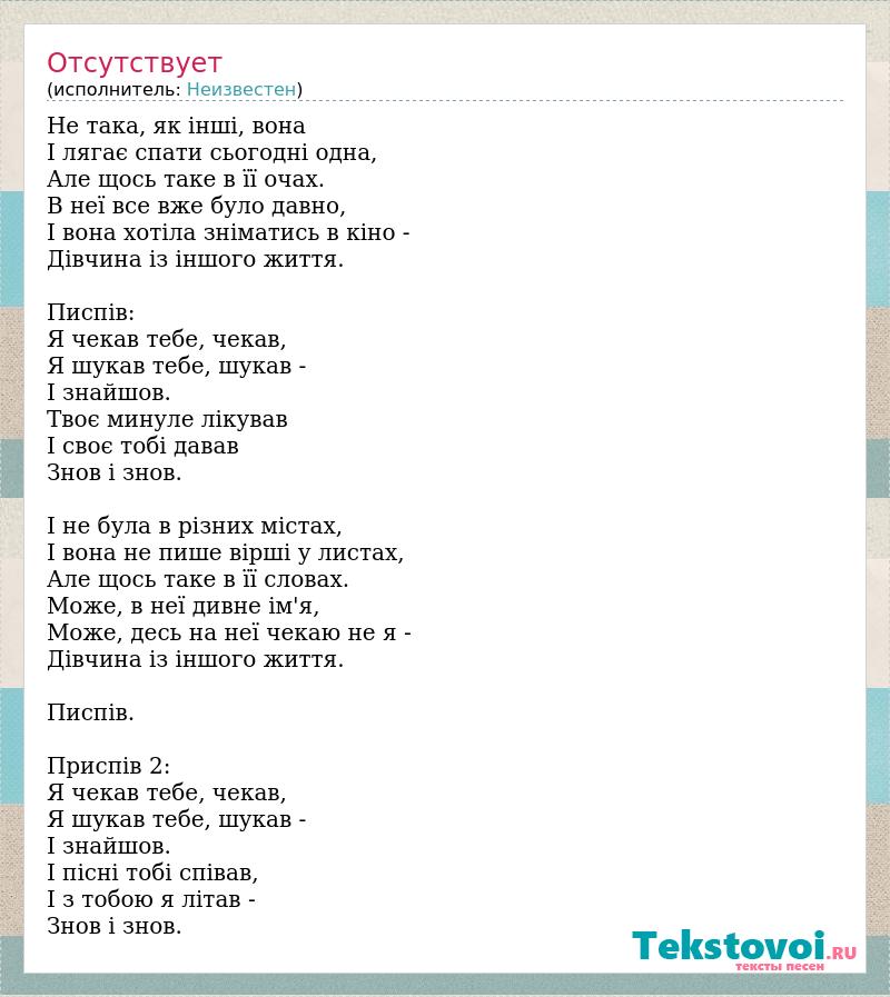 Не така, як iншi, вона I лягає спати сьогоднi одна, Але щось таке в її очах. В неї все вже було давно, I вона хотiла знiматись в кiно - Дiвчина iз iншого життя. Писпів: Я чекав тебе, чекав, Я шукав тебе, шукав - I знайшов. Твоє минуле лiкував I своє тобi давав Знов i знов. I не була в рiзних мiстах, I вона не пише вiршi у листах, Але щось таке в її словах. Може, в неї дивне iм'я, Може, десь на неї чекаю не я - Дiвчина iз iншого життя. Писпів. Приспів 2: Я чекав тебе, чекав, Я шукав тебе, шукав - I знайшов. I пiснi тобi спiвав, I з тобою я лiтав - Знов i знов.