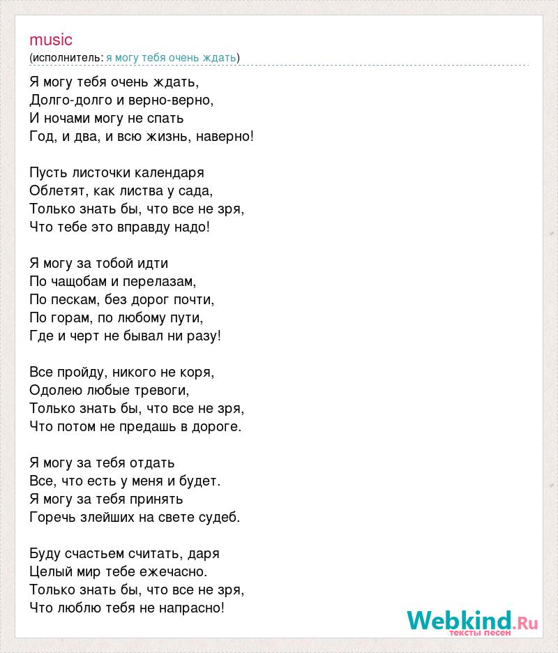 Я могу тебя очень ждать, Долго-долго и верно-верно, И ночами могу не спать Год, и два, и всю жизнь, наверно! Пусть листочки календаря Облетят, как листва у сада, Только знать бы, что все не зря, Что тебе это вправду надо! Я могу за тобой идти По чащобам и перелазам, По пескам, без дорог почти, По горам, по любому пути, Где и черт не бывал ни разу! Все пройду, никого не коря, Одолею любые тревоги, Только знать бы, что все не зря, Что потом не предашь в дороге. Я могу за тебя отдать Все, что есть у меня и будет. Я могу за тебя принять Горечь злейших на свете судеб. Буду счастьем считать, даря Целый мир тебе ежечасно. Только знать бы, что все не зря, Что люблю тебя не напрасно!