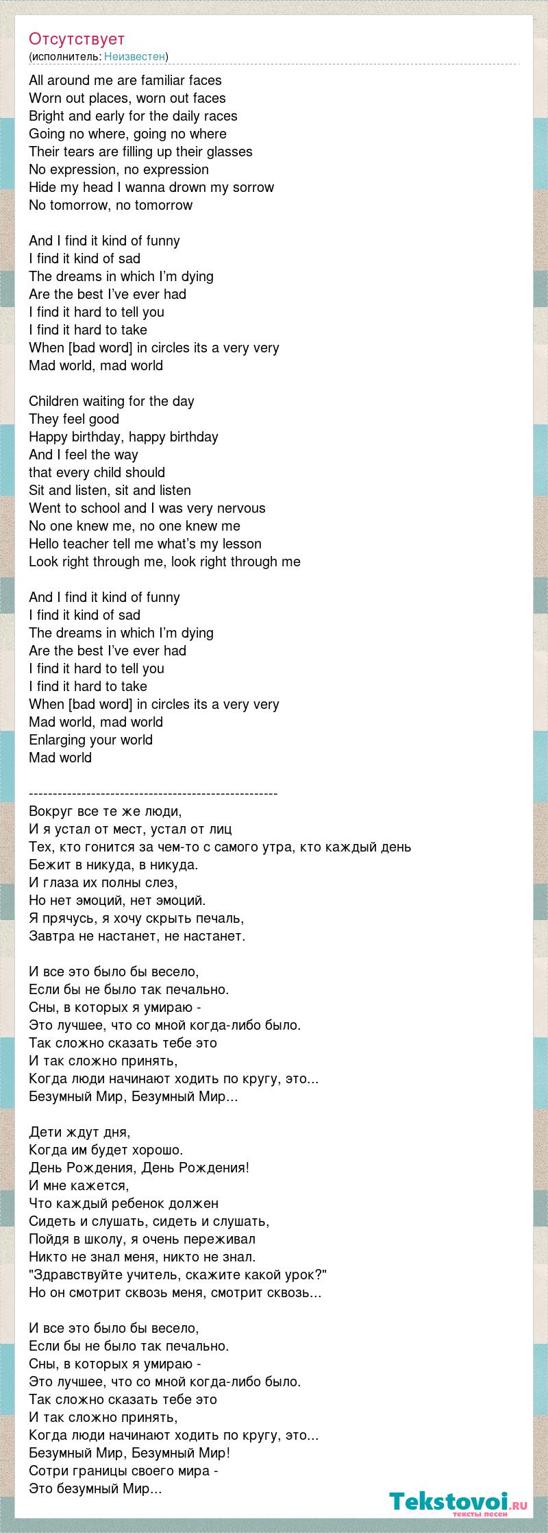 All around me are familiar faces Worn out places, worn out faces Bright and early for the daily races Going no where, going no where Their tears are filling up their glasses No expression, no expression Hide my head I wanna drown my sorrow No tomorrow, no tomorrow And I find it kind of funny I find it kind of sad The dreams in which I’m dying Are the best I’ve ever had I find it hard to tell you I find it hard to take When [bad word] in circles its a very very Mad world, mad world Children waiting for the day They feel good Happy birthday, happy birthday And I feel the way that every child should Sit and listen, sit and listen Went to school and I was very nervous No one knew me, no one knew me Hello teacher tell me what’s my lesson Look right through me, look right through me And I find it kind of funny I find it kind of sad The dreams in which I’m dying Are the best I’ve ever had I find it hard to tell you I find it hard to take When [bad word] in circles its a very very Mad world, mad world Enlarging your world Mad world ---------------------------------------------------- Вокруг все те же люди, И я устал от мест, устал от лиц Тех, кто гонится за чем-то с самого утра, кто каждый день Бежит в никуда, в никуда. И глаза их полны слез, Но нет эмоций, нет эмоций. Я прячусь, я хочу скрыть печаль, Завтра не настанет, не настанет. И все это было бы весело, Если бы не было так печально. Сны, в которых я умираю - Это лучшее, что со мной когда-либо было. Так сложно сказать тебе это И так сложно принять, Когда люди начинают ходить по кругу, это... Безумный Мир, Безумный Мир... Дети ждут дня, Когда им будет хорошо. День Рождения, День Рождения! И мне кажется, Что каждый ребенок должен Сидеть и слушать, сидеть и слушать, Пойдя в школу, я очень переживал Никто не знал меня, никто не знал. "Здравствуйте учитель, скажите какой урок?" Но он смотрит сквозь меня, смотрит сквозь... И все это было бы весело, Если бы не было так печально. Сны, в которых я умираю - Это лучшее, что со мной когда-либо было. Так сложно сказать тебе это И так сложно принять, Когда люди начинают ходить по кругу, это... Безумный Мир, Безумный Мир! Сотри границы своего мира - Это безумный Мир...
