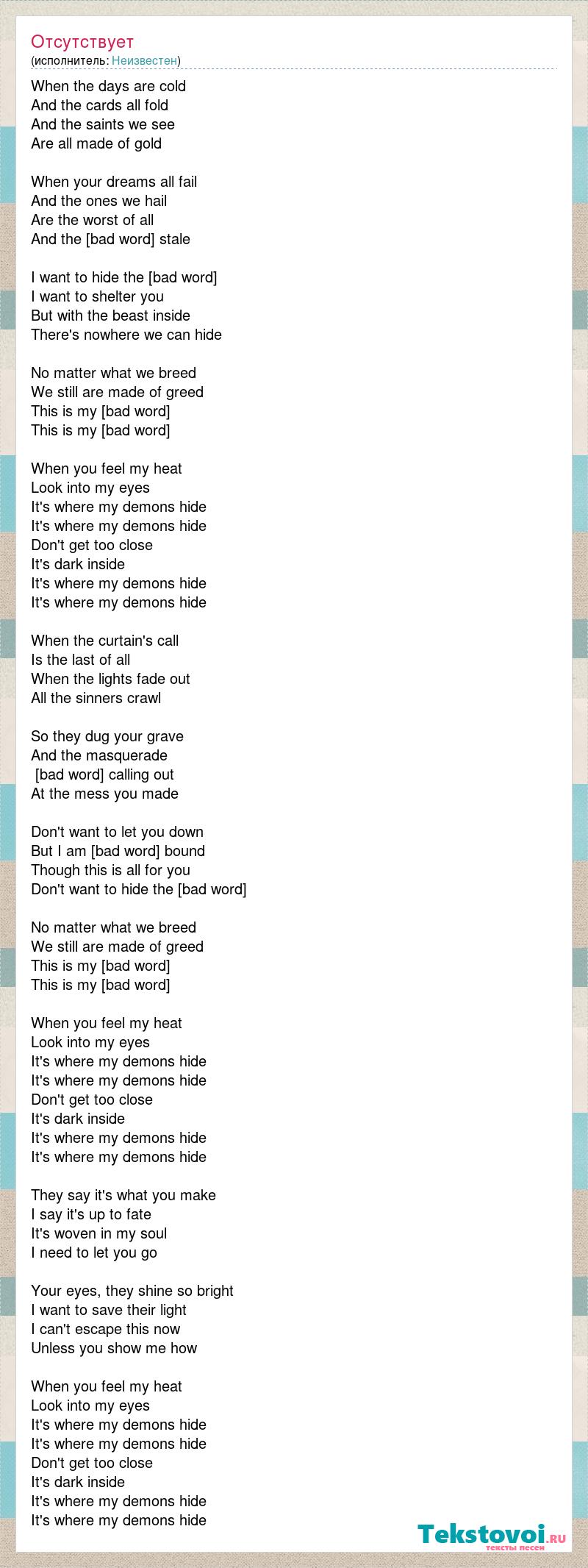 When the days are cold And the cards all fold And the saints we see Are all made of gold When your dreams all fail And the ones we hail Are the worst of all And the [bad word] stale I want to hide the [bad word] I want to shelter you But with the beast inside There's nowhere we can hide No matter what we breed We still are made of greed This is my [bad word] This is my [bad word] When you feel my heat Look into my eyes It's where my demons hide It's where my demons hide Don't get too close It's dark inside It's where my demons hide It's where my demons hide When the curtain's call Is the last of all When the lights fade out All the sinners crawl So they dug your grave And the masquerade [bad word] calling out At the mess you made Don't want to let you down But I am [bad word] bound Though this is all for you Don't want to hide the [bad word] No matter what we breed We still are made of greed This is my [bad word] This is my [bad word] When you feel my heat Look into my eyes It's where my demons hide It's where my demons hide Don't get too close It's dark inside It's where my demons hide It's where my demons hide They say it's what you make I say it's up to fate It's woven in my soul I need to let you go Your eyes, they shine so bright I want to save their light I can't escape this now Unless you show me how When you feel my heat Look into my eyes It's where my demons hide It's where my demons hide Don't get too close It's dark inside It's where my demons hide It's where my demons hide