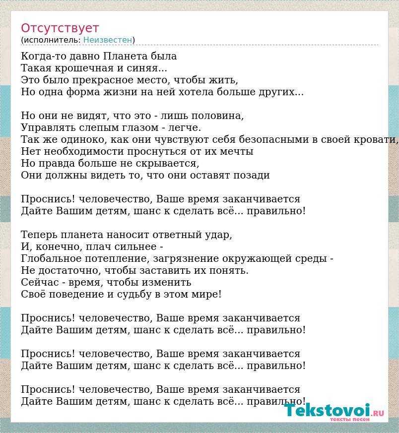 Когда-то давно Планета была Такая крошечная и синяя... Это было прекрасное место, чтобы жить, Но одна форма жизни на ней хотела больше других... Но они не видят, что это - лишь половина, Управлять слепым глазом - легче. Так же одиноко, как они чувствуют себя безопасными в своей кровати, Нет необходимости проснуться от их мечты Но правда больше не скрывается, Они должны видеть то, что они оставят позади Проснись! человечество, Ваше время заканчивается Дайте Вашим детям, шанс к сделать всё... правильно! Теперь планета наносит ответный удар, И, конечно, плач сильнее - Глобальное потепление, загрязнение окружающей среды - Не достаточно, чтобы заставить их понять. Сейчас - время, чтобы изменить Своё поведение и судьбу в этом мире! Проснись! человечество, Ваше время заканчивается Дайте Вашим детям, шанс к сделать всё... правильно! Проснись! человечество, Ваше время заканчивается Дайте Вашим детям, шанс к сделать всё... правильно! Проснись! человечество, Ваше время заканчивается Дайте Вашим детям, шанс к сделать всё... правильно!