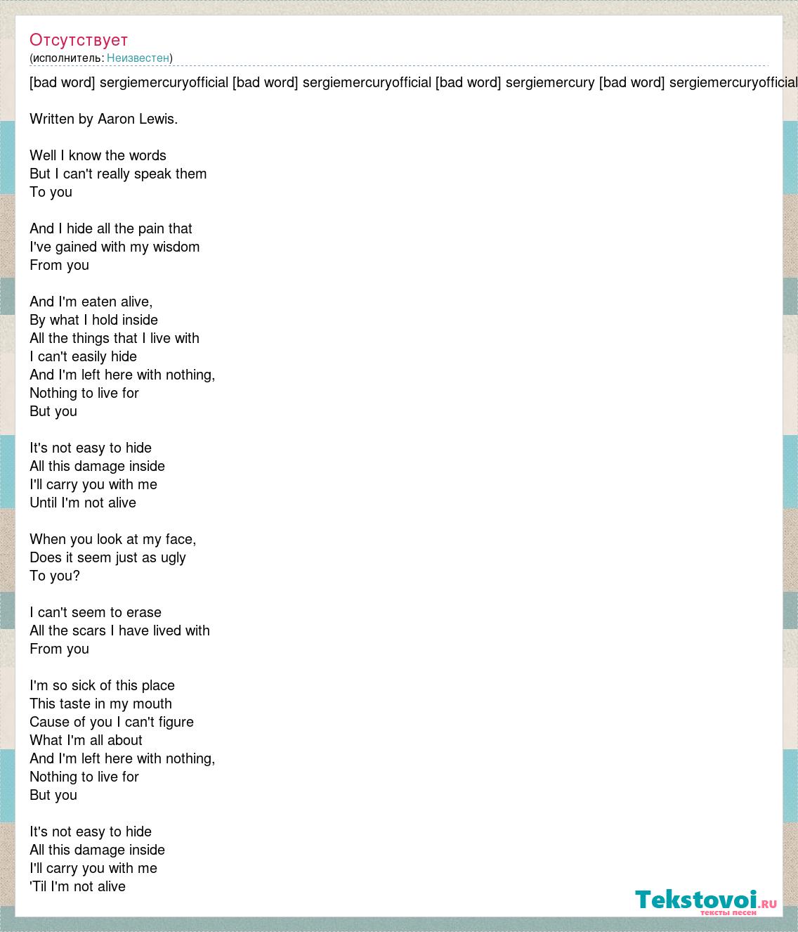 [bad word] sergiemercuryofficial [bad word] sergiemercuryofficial [bad word] sergiemercury [bad word] sergiemercuryofficial Written by Aaron Lewis. Well I know the words But I can't really speak them To you And I hide all the pain that I've gained with my wisdom From you And I'm eaten alive, By what I hold inside All the things that I live with I can't easily hide And I'm left here with nothing, Nothing to live for But you It's not easy to hide All this damage inside I'll carry you with me Until I'm not alive When you look at my face, Does it seem just as ugly To you? I can't seem to erase All the scars I have lived with From you I'm so sick of this place This taste in my mouth Cause of you I can't figure What I'm all about And I'm left here with nothing, Nothing to live for But you It's not easy to hide All this damage inside I'll carry you with me 'Til I'm not alive