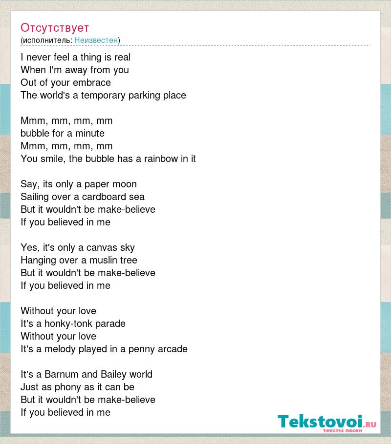I never feel a thing is real When I'm away from you Out of your embrace The world's a temporary parking place Mmm, mm, mm, mm bubble for a minute Mmm, mm, mm, mm You smile, the bubble has a rainbow in it Say, its only a paper moon Sailing over a cardboard sea But it wouldn't be make-believe If you believed in me Yes, it's only a canvas sky Hanging over a muslin tree But it wouldn't be make-believe If you believed in me Without your love It's a honky-tonk parade Without your love It's a melody played in a penny arcade It's a Barnum and Bailey world Just as phony as it can be But it wouldn't be make-believe If you believed in me