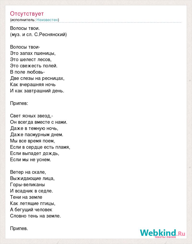 Волосы твои. (муз. и сл. С.Реснянский) Волосы твои- Это запах пшеницы, Это шелест лесов, Это свежесть полей. В поле любовь- Две слезы на ресницах, Как вчерашняя ночь И как завтрашний день. Припев: Свет ясных звезд,- Он всегда вместе с нами. Даже в темную ночь, Даже пасмурным днем. Мы все время поем, Если в сердце есть пламя, Если выпадет дождь, Если мы не уснем. Ветер на скале, Выжидающие лица, Горы-великаны И всадник в седле. Тени на земле Как летящие птицы, А бегущий человек Словно тень на земле. Припев.