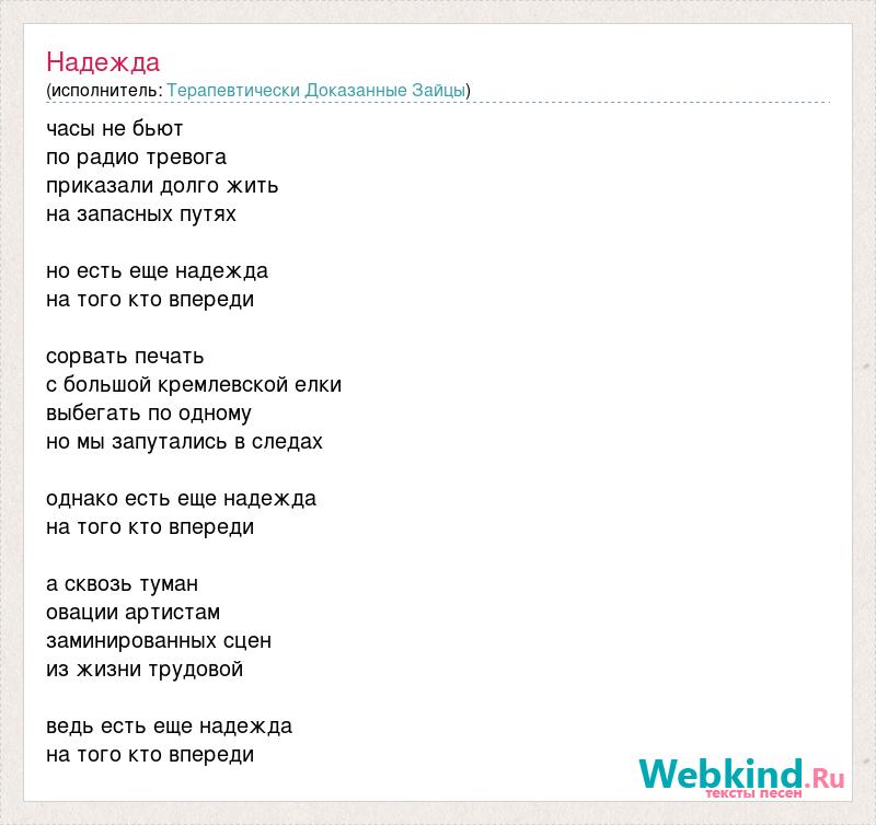часы не бьют по радио тревога приказали долго жить на запасных путях но есть еще надежда на того кто впереди сорвать печать с большой кремлевской елки выбегать по одному но мы запутались в следах однако есть еще надежда на того кто впереди а сквозь туман овации артистам заминированных сцен из жизни трудовой ведь есть еще надежда на того кто впереди