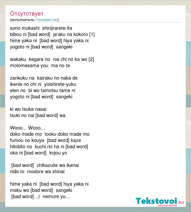 sono mukashi shinjirarete-ita bibou ni [bad word] ja'aku na kokoro [1] hime yaka ni [bad word] hiya yaka ni yogoto ni [bad word] sangeki wakaku kegare no nai chi no ka wo [2] motomesama you ma no te zankoku na kairaku no naka de ikenie no chi ni yoishirete-yuku eien no bi wo tamotsu tame ni yogoto ni [bad word] sangeki ki wo tsuke nasai tsuki no nai [bad word] wa Wooo... Wooo... doko made mo tooku doko made mo fumou no kouya [bad word] kaze hitobito no kuchi no ha ni [bad word] oka ni [bad word] kojou yo [bad word] chikazuite wa ikenai nido to modore wa shinai hime yaka ni [bad word] hiya yaka ni maku wo [bad word] sangeki [bad word] ..) nemure yo...