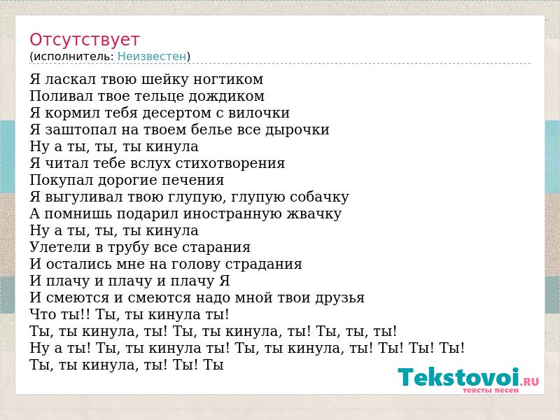 Ну а ты! Ты, ты кинула ты! Ты, ты кинула, ты! Ты! Ты! Ты!