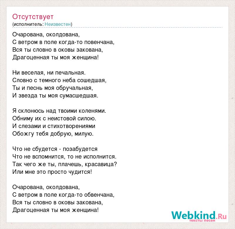 Очарована, околдована, С ветром в поле когда-то повенчана, Вся ты словно в оковы закована, Драгоценная ты моя женщина! Ни веселая, ни печальная. Словно с темного неба сошедшая, Ты и песнь моя обручальная, И звезда ты моя сумасшедшая. Я склонюсь над твоими коленями. Обниму их с неистовой силою. И слезами и стихотворениями Обожгу тебя добрую, милую. Что не сбудется - позабудется Что не вспомнится, то не исполнится. Так чего же ты, плачешь, красавица? Или мне это просто чудится! Очарована, околдована, С ветром в поле когда-то обвенчана, Вся ты словно в оковы закована, Драгоценная ты моя женщина!