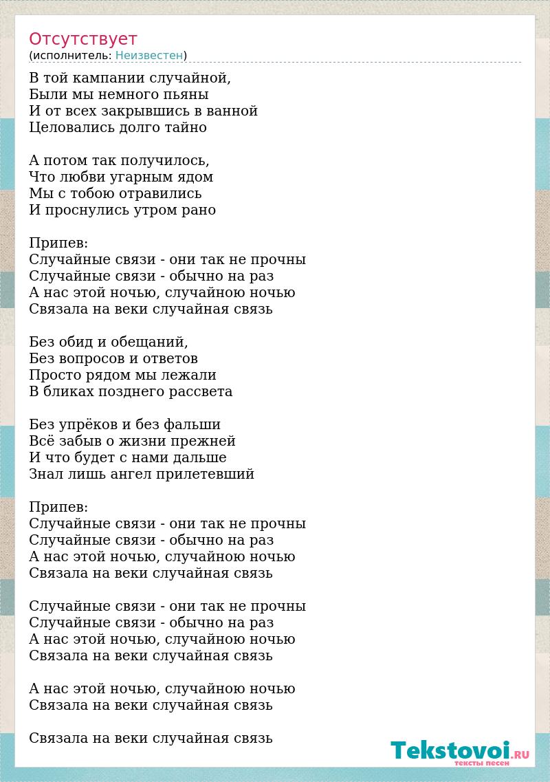 В той кампании случайной, Были мы немного пьяны И от всех закрывшись в ванной Целовались долго тайно А потом так получилось, Что любви угарным ядом Мы с тобою отравились И проснулись утром рано Припев: Случайные связи - они так не прочны Случайные связи - обычно на раз А нас этой ночью, случайною ночью Связала на веки случайная связь Без обид и обещаний, Без вопросов и ответов Просто рядом мы лежали В бликах позднего рассвета Без упрёков и без фальши Всё забыв о жизни прежней И что будет с нами дальше Знал лишь ангел прилетевший Припев: Случайные связи - они так не прочны Случайные связи - обычно на раз А нас этой ночью, случайною ночью Связала на веки случайная связь Случайные связи - они так не прочны Случайные связи - обычно на раз А нас этой ночью, случайною ночью Связала на веки случайная связь А нас этой ночью, случайною ночью Связала на веки случайная связь Связала на веки случайная связь