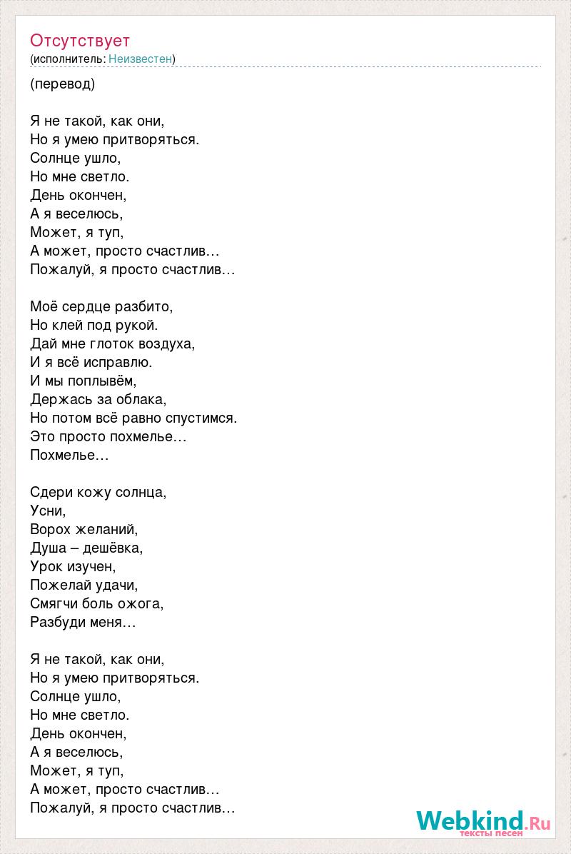 (перевод) Я не такой, как они, Но я умею притворяться. Солнце ушло, Но мне светло. День окончен, А я веселюсь, Может, я туп, А может, просто счастлив… Пожалуй, я просто счастлив… Моё сердце разбито, Но клей под рукой. Дай мне глоток воздуха, И я всё исправлю. И мы поплывём, Держась за облака, Но потом всё равно спустимся. Это просто похмелье… Похмелье… Сдери кожу солнца, Усни, Ворох желаний, Душа – дешёвка, Урок изучен, Пожелай удачи, Смягчи боль ожога, Разбуди меня… Я не такой, как они, Но я умею притворяться. Солнце ушло, Но мне светло. День окончен, А я веселюсь, Может, я туп, А может, просто счастлив… Пожалуй, я просто счастлив…