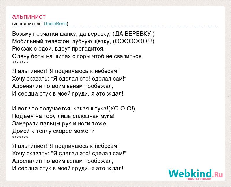Возьму перчатки шапку, да веревку, (ДА ВЕРЕВКУ!) Мобильный телефон, зубную щетку, (ООООООО!!!) Рюкзак с едой, вдруг прегодится, Одену боты на шипах с горы чтоб не свалиться. ******* Я альпинист! Я поднимаюсь к небесам! Хочу сказать: "Я сделал это! сделал сам!" Адреналин по моим венам пробежал, И сердца стук в моей груди. я это ждал! _______ И вот что получается, какая штука!(УО О О!) Подъем на гору лишь сплошная мука! Замерзли пальцы рук и ноги тоже. Домой к теплу скорее может? ******* Я альпинист! Я поднимаюсь к небесам! Хочу сказать: "Я сделал это! сделал сам!" Адреналин по моим венам пробежал, И сердца стук в моей груди. я это ждал!