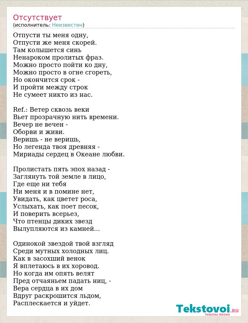 Отпусти ты меня одну, Отпусти же меня скорей. Там колышется синь Ненароком пролитых фраз. Можно просто пойти ко дну, Можно просто в огне сгореть, Но окончится срок - И пройти между строк Не сумеет никто из нас. Ref.: Ветер сквозь веки Вьет прозрачную нить времени. Вечер не вечен - Оборви и живи. Веришь - не веришь, Но легенда твоя древняя - Мириады сердец в Океане любви. Пролистать пять эпох назад - Заглянуть той земле в лицо, Где еще ни тебя Ни меня и в помине нет, Увидать, как цветет роса, Услыхать, как поет песок, И поверить всерьез, Что птенцы диких звезд Вылупляются из камней... Одинокой звездой твой взгляд Среди мутных холодных лиц. Как в засохший венок Я вплетаюсь в их хоровод. Но когда им опять велят Пред отчаяньем падать ниц, - Вера сердца в их дом Вдруг раскрошится льдом, Расплескается и уйдет.
