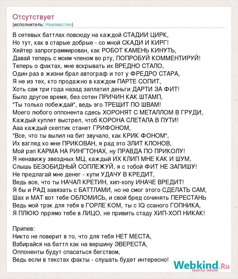 В сетевых баттлах повсюду на каждой СТАДИИ ЦИРК, Но тут, как в старые добрые - со мной СКАДИ И КИРГ! Хейтер запрограммирован, как РОБОТ КАМЕНЬ КИНУТЬ, Давай теперь с моим членом во рту, ПОПРОБУЙ КОММЕНТИРУЙ! Теперь о фактах, мне вскрывать их ВРЕДНО СТАЛО, Один раз в жизни брал автограф и тот у ФРЕДРО СТАРА, Я не из тех, кто продажно в каждом ПАРТЕ СОПИТ, Хоть сам три года назад заплатил деньги ДАРТИ ЗА ФИТ! Было другое время, без сотен ПРИЧИН КАК ШТАМП, "Ты только побеждай", ведь эго ТРЕЩИТ ПО ШВАМ! Моего любого оппонента сдесь ХОРОНЯТ С МЕТАЛЛОМ В ГРУДИ, Каждый куплет выстрел, чтоб КОРОНА СЛЕТАЛА В ПУТИ! Ааа каждый скептик станет ГРИФОНОМ, "Все, что ты вылил на бит звучало, как КРИК ФОНОМ", Их взгляд ко мне ПРИКОВАН, я рад это ЗЛИТ КЛОНОВ, Мой рэп КАРМА НА РИНГТОНАХ, ну ПРАВДА ПО ПРИКОЛУ! Я ненавижу звездных МЦ, каждый ИХ КЛИП МНЕ КАК И ШУМ, Слышь БЕЗОБИДНЫЙ СОПЛЕЖУЙ, я с тобой ФИТ НЕ ЗАПИШУ! Не предлагай мне денег - купи УДАЧУ В КРЕДИТ, Ведь все, что ты НАЧАЛ КРЕТИН, хип-хопу ИНАЧЕ ВРЕДИТ! Я бы и РАД завязать с БАТТЛАМИ, но не смог этого СДЕЛАТЬ САМ, Шах и МАТ вот тебе ОБЛОМИСЬ, и свой бред сочинять ПЕРЕСТАНЬ Ведь мой трэк для тебя в ГОРЛЕ КОМ, ты с IQ ссаного ГОПНИКА, Я ПЛЮЮ пррямо тебе в ЛИЦО, не привить стаду ХИП-ХОП НИКАК! Припев: Никто не поверит в то, что для тебя НЕТ МЕСТА, Взбирайся на баттл как на вершину ЭВЕРЕСТА, Оппоненты будут спасаться бегством, Ведь если в текстах факты - слушать будет интересно!