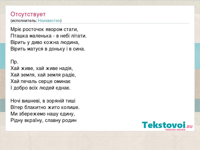 Мріє росточок явором стати, Пташка маленька - в небі літати. Вірить у диво кожна людина, Вірить матуся в доньку і в сина. Пр. Хай живе, хай живе надія, Хай земля, хай земля радіє, Хай печаль серце оминає І добро всіх людей єднає. Ночі вишневі, в зоряній тиші Вітер блакитно жито колише. Ми збережемо нашу єдину, Рідну вкраїну, славну родин