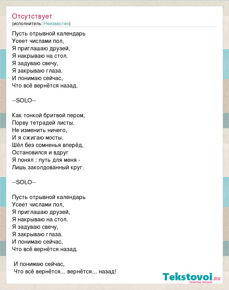 Пусть отрывной календарь Усеет числами пол, Я приглашаю друзей, Я накрываю на стол. Я задуваю свечу, Я закрываю глаза. И понимаю сейчас, Что всё вернётся назад. --SOLO-- Как тонкой бритвой пером, Порву тетрадей листы. Не изменить ничего, И я сжигаю мосты. Шёл без сомненья вперёд, Остановился и вдруг Я понял : путь для меня - Лишь заколдованный круг. --SOLO-- Пусть отрывной календарь Усеет числами пол, Я приглашаю друзей, Я накрываю на стол. Я задуваю свечу, Я закрываю глаза. И понимаю сейчас, Что всё вернётся назад. И понимаю сейчас, Что всё вернётся... вернётся... назад!