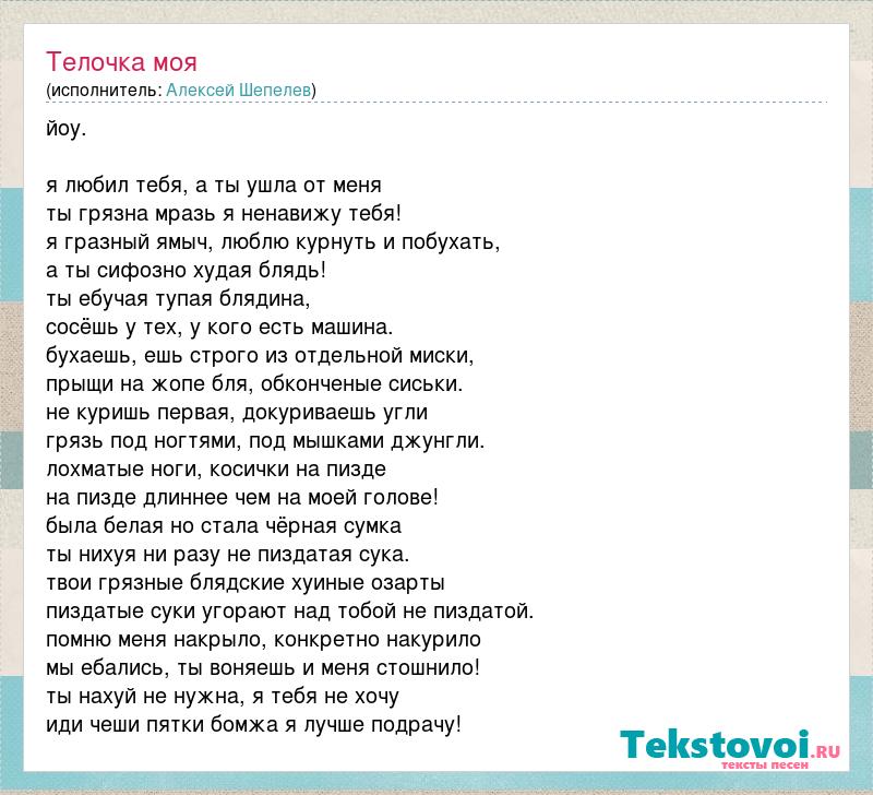 йоу. я любил тебя, а ты ушла от меня ты грязна мразь я ненавижу тебя! я гразный ямыч, люблю курнуть и побухать, а ты сифозно худая блядь! ты ебучая тупая блядина, сосёшь у тех, у кого есть машина. бухаешь, ешь строго из отдельной миски, прыщи на жопе бля, обконченые сиськи. не куришь первая, докуриваешь угли грязь под ногтями, под мышками джунгли. лохматые ноги, косички на пизде на пизде длиннее чем на моей голове! была белая но стала чёрная сумка ты нихуя ни разу не пиздатая сука. твои грязные блядские хуиные озарты пиздатые суки угорают над тобой не пиздатой. помню меня накрыло, конкретно накурило мы ебались, ты воняешь и меня стошнило! ты нахуй не нужна, я тебя не хочу иди чеши пятки бомжа я лучше подрачу!