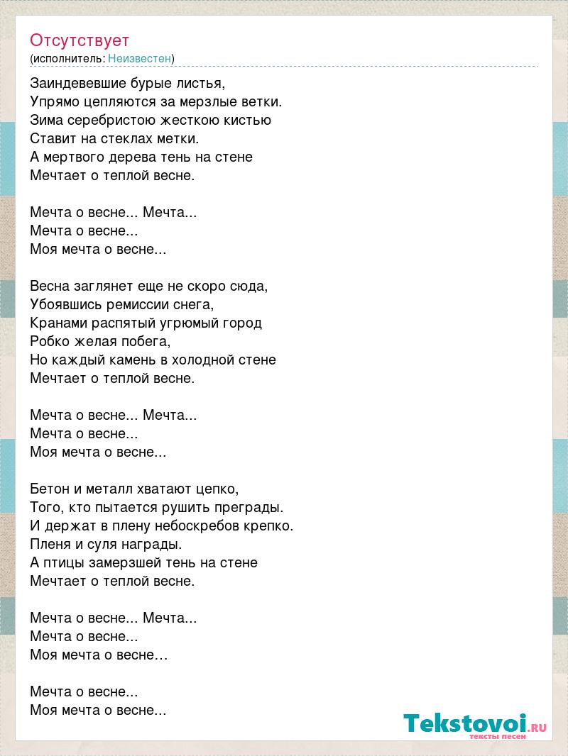 Заиндевевшие бурые листья, Упрямо цепляются за мерзлые ветки. Зима серебристою жесткою кистью Ставит на стеклах метки. А мертвого дерева тень на стене Мечтает о теплой весне. Мечта о весне... Мечта... Мечта о весне... Моя мечта о весне... Весна заглянет еще не скоро сюда, Убоявшись ремиссии снега, Кранами распятый угрюмый город Робко желая побега, Но каждый камень в холодной стене Мечтает о теплой весне. Мечта о весне... Мечта... Мечта о весне... Моя мечта о весне... Бетон и металл хватают цепко, Того, кто пытается рушить преграды. И держат в плену небоскребов крепко. Пленя и суля награды. А птицы замерзшей тень на стене Мечтает о теплой весне. Мечта о весне... Мечта... Мечта о весне... Моя мечта о весне… Мечта о весне... Моя мечта о весне...