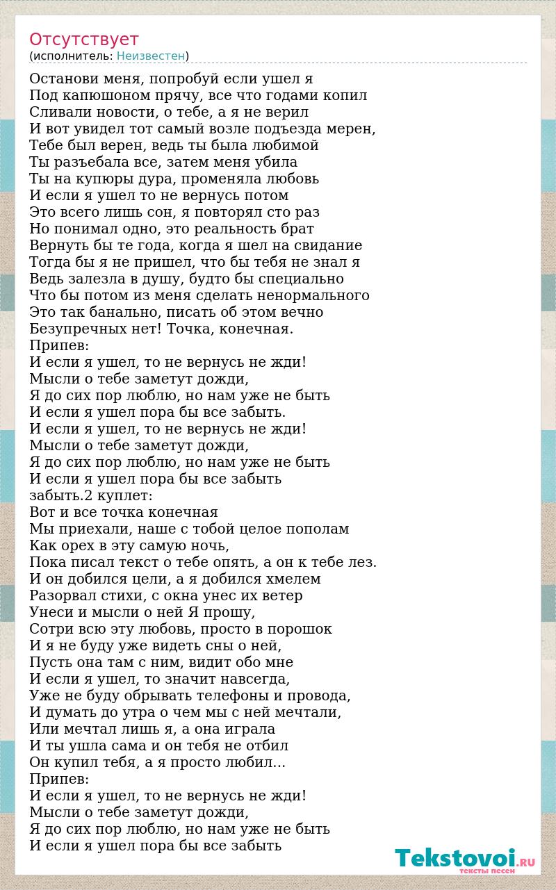 Останови меня, попробуй если ушел я Под капюшоном прячу, все что годами копил Сливали новости, о тебе, а я не верил И вот увидел тот самый возле подъезда мерен, Тебе был верен, ведь ты была любимой Ты разъебала все, затем меня убила Ты на купюры дура, променяла любовь И если я ушел то не вернусь потом Это всего лишь сон, я повторял сто раз Но понимал одно, это реальность брат Вернуть бы те года, когда я шел на свидание Тогда бы я не пришел, что бы тебя не знал я Ведь залезла в душу, будто бы специально Что бы потом из меня сделать ненормального Это так банально, писать об этом вечно Безупречных нет! Точка, конечная. Припев: И если я ушел, то не вернусь не жди! Мысли о тебе заметут дожди, Я до сих пор люблю, но нам уже не быть И если я ушел пора бы все забыть. И если я ушел, то не вернусь не жди! Мысли о тебе заметут дожди, Я до сих пор люблю, но нам уже не быть И если я ушел пора бы все забыть забыть.2 куплет: Вот и все точка конечная Мы приехали, наше с тобой целое пополам Как орех в эту самую ночь, Пока писал текст о тебе опять, а он к тебе лез. И он добился цели, а я добился хмелем Разорвал стихи, с окна унес их ветер Унеси и мысли о ней Я прошу, Сотри всю эту любовь, просто в порошок И я не буду уже видеть сны о ней, Пусть она там с ним, видит обо мне И если я ушел, то значит навсегда, Уже не буду обрывать телефоны и провода, И думать до утра о чем мы с ней мечтали, Или мечтал лишь я, а она играла И ты ушла сама и он тебя не отбил Он купил тебя, а я просто любил... Припев: И если я ушел, то не вернусь не жди! Мысли о тебе заметут дожди, Я до сих пор люблю, но нам уже не быть И если я ушел пора бы все забыть
