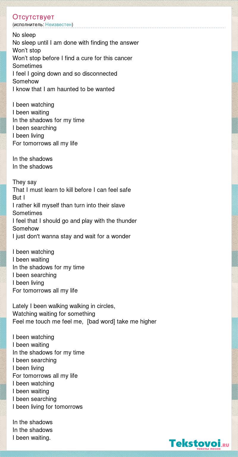 No sleep No sleep until I am done with finding the answer Won’t stop Won’t stop before I find a cure for this cancer Sometimes I feel I going down and so disconnected Somehow I know that I am haunted to be wanted I been watching I been waiting In the shadows for my time I been searching I been living For tomorrows all my life In the shadows In the shadows They say That I must learn to kill before I can feel safe But I I rather kill myself than turn into their slave Sometimes I feel that I should go and play with the thunder Somehow I just don't wanna stay and wait for a wonder I been watching I been waiting In the shadows for my time I been searching I been living For tomorrows all my life Lately I been walking walking in circles, Watching waiting for something Feel me touch me feel me, [bad word] take me higher I been watching I been waiting In the shadows for my time I been searching I been living For tomorrows all my life I been watching I been waiting I been searching I been living for tomorrows In the shadows In the shadows I been waiting.