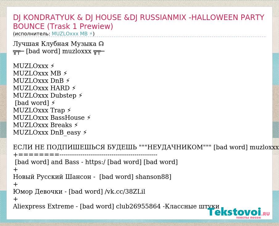 Лучшая Клубная Музыка ☊ ︻╦╤─ [bad word] muzloxxx ︻╦╤─ MUZLOxxx ⚡ MUZLOxxx MB ⚡ MUZLOxxx DnB ⚡ MUZLOxxx HARD ⚡ MUZLOxxx Dubstep ⚡ [bad word] ⚡ MUZLOxxx Trap ⚡ MUZLOxxx BassHouse ⚡ MUZLOxxx Breaks ⚡ MUZLOxxx DnB_easy ⚡ ЕСЛИ НЕ ПОДПИШЕШЬСЯ БУДЕШЬ """НЕУДАЧНИКОМ""" [bad word] muzloxxx +========----------------------------------------------- [bad word] and Bass - https:/ [bad word] [bad word] + Новый Русский Шансон - [bad word] shanson88] + Юмор Девочки - [bad word] /vk.cc/38ZLil + Aliexpress Extreme - [bad word] club26955864 -Классные штуки