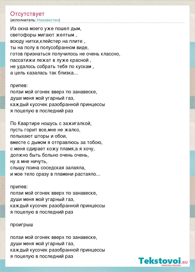 Из окна моего уже пошел дым, светофоры мигают желтым , всюду нитки,клейстер на плите , ты на полу в полусобранном виде, готов признаться получилось не очень классно, пассатижи лежат в луже красной , не удалось собрать тебя по кускам , а цель казалась так близка... припев: ползи мой огонек вверх по занавеске, души меня мой угарный газ, каждый кусочек разобранной принцессы я поцелую в последний раз По Квартире ношусь с зажигалкой, пусть горит все,мне не жалко, полыхают шторы и обои, вместе с дымом я отправлюсь за тобою, с меня сдирает кожу пламя,а я хочу, должно быть больно очень очень, ну а мне ничуть, слышу псина соседская залаяла, и мое тело сразу в пламени растаяло... припев: ползи мой огонек вверх по занавеске, души меня мой угарный газ, каждый кусочек разобранной принцессы я поцелую в последний раз проигрыш ползи мой огонек вверх по занавеске, души меня мой угарный газ, каждый кусочек разобранной принцессы я поцелую в последний раз