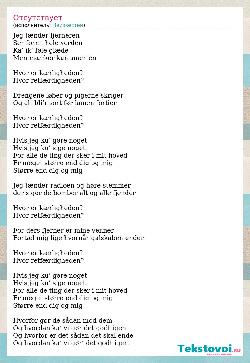 Jeg tænder fjerneren Ser førn i hele verden Ka’ ik’ føle glæde Men mærker kun smerten Hvor er kærligheden? Hvor retfærdigheden? Drengene løber og pigerne skriger Og alt bli’r sort før lamen fortier Hvor er kærligheden? Hvor retfærdigheden? Hvis jeg ku’ gøre noget Hvis jeg ku’ sige noget For alle de ting der sker i mit hoved Er meget større end dig og mig Større end dig og mig Jeg tænder radioen og høre stemmer der siger de bomber alt og alle fjender Hvor er kærligheden? Hvor retfærdigheden? For ders fjerner er mine venner Fortæl mig lige hvornår galskaben ender Hvor er kærligheden? Hvor retfærdigheden? Hvis jeg ku’ gøre noget Hvis jeg ku’ sige noget For alle de ting der sker i mit hoved Er meget større end dig og mig Større end dig og mig Hvorfor gør de sådan mod dem Og hvordan ka’ vi gør det godt igen Og hvorfor er det sådan det skal ende Og hvordan ka’ vi gør’ det godt igen.