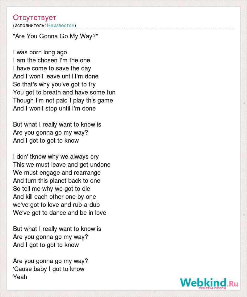 "Are You Gonna Go My Way?" I was born long ago I am the chosen I'm the one I [bad word] to save the day And I won't leave until I'm done So that's why you've got to try You got to breath and have some fun Though I'm not paid I play this game And I won't stop until I'm done But what I really want to know is Are you gonna go my way? And I got to got to know I don' tknow why we always cry This we must leave and get undone We must engage and rearrange And turn this planet back to one So tell me why we got to die And kill each other one by one we've got to love [bad word] a-dub We've got to dance and be in love But what I really want to know is Are you gonna go my way? And I got to got to know Are you gonna go my way? 'Cause baby I got to know Yeah