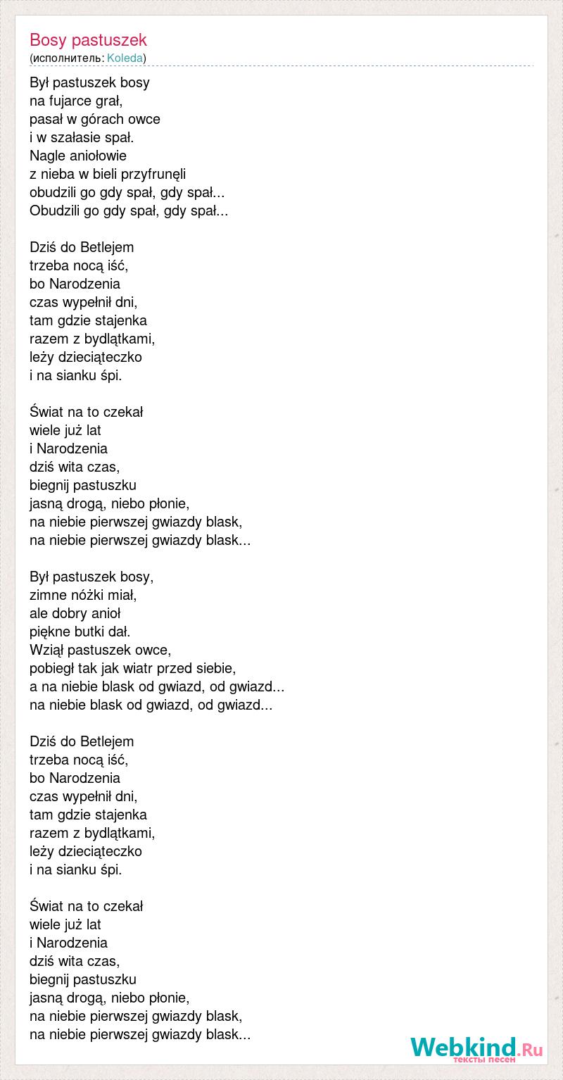 Był pastuszek bosy na fujarce grał, pasał w górach owce i w szałasie spał. Nagle aniołowie z nieba w bieli [bad word] li obudzili go gdy spał, gdy spał... Obudzili go gdy spał, gdy spał... Dziś do Betlejem trzeba nocą iść, bo Narodzenia czas wypełnił dni, tam gdzie stajenka razem z bydlątkami, leży dzieciąteczko i na sianku śpi. Świat na to czekał wiele już lat i Narodzenia dziś wita czas, biegnij pastuszku jasną drogą, niebo płonie, na niebie pierwszej gwiazdy blask, na niebie pierwszej gwiazdy blask... Był pastuszek bosy, zimne nóżki miał, ale dobry anioł piękne butki dał. Wziął pastuszek owce, pobiegł tak jak wiatr przed siebie, a na niebie blask od gwiazd, od gwiazd... na niebie blask od gwiazd, od gwiazd... Dziś do Betlejem trzeba nocą iść, bo Narodzenia czas wypełnił dni, tam gdzie stajenka razem z bydlątkami, leży dzieciąteczko i na sianku śpi. Świat na to czekał wiele już lat i Narodzenia dziś wita czas, biegnij pastuszku jasną drogą, niebo płonie, na niebie pierwszej gwiazdy blask, na niebie pierwszej gwiazdy blask...
