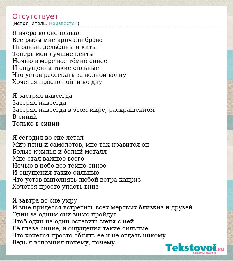 Я вчера во сне плавал Все рыбы мне кричали браво Пираньи, дельфины и киты Теперь мои лучшие кенты Ночью в море все тёмно-синее И ощущения такие сильные Что устав рассекать за волной волну Хочется просто пойти ко дну Я застрял навсегда Застрял навсегда Застрял навсегда в этом мире, раскрашенном В синий Только в синий Я сегодня во сне летал Мир птиц и самолетов, мне так нравится он Белые крылья и белый металл Мне стал важнее всего Ночью в небе все темно-синее И ощущения такие сильные Что устав выполнять любой ветра каприз Хочется просто упасть вниз Я завтра во сне умру И мне придется встретить всех мертвых близкиз и друзей Один за одним они мимо пройдут Чтоб один на один оставить меня с ней Её глаза синие, и ощущения такие сильные Что хочется просто обнять ее и не отдать никому Ведь я вспомнил почему, почему...