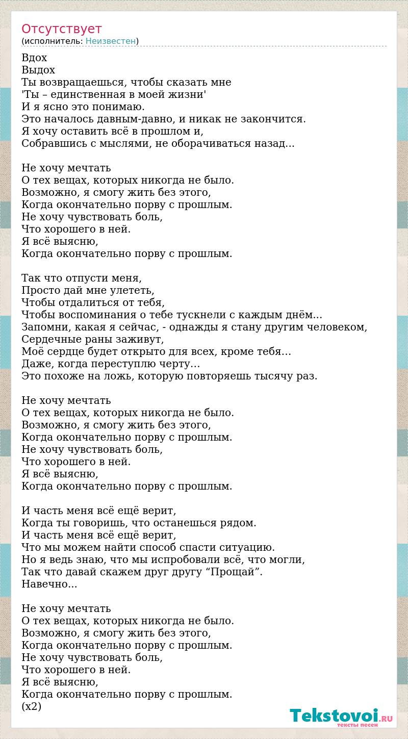 Вдох Выдох Ты возвращаешься, чтобы сказать мне 'Ты – единственная в моей жизни' И я ясно это понимаю. Это началось давным-давно, и никак не закончится. Я хочу оставить всё в прошлом и, Собравшись с мыслями, не оборачиваться назад... Не хочу мечтать О тех вещах, которых никогда не было. Возможно, я смогу жить без этого, Когда окончательно порву с прошлым. Не хочу чувствовать боль, Что хорошего в ней. Я всё выясню, Когда окончательно порву с прошлым. Так что отпусти меня, Просто дай мне улететь, Чтобы отдалиться от тебя, Чтобы воспоминания о тебе тускнели с каждым днём... Запомни, какая я сейчас, - однажды я стану другим человеком, Сердечные раны заживут, Моё сердце будет открыто для всех, кроме тебя… Даже, когда переступлю черту… Это похоже на ложь, которую повторяешь тысячу раз. Не хочу мечтать О тех вещах, которых никогда не было. Возможно, я смогу жить без этого, Когда окончательно порву с прошлым. Не хочу чувствовать боль, Что хорошего в ней. Я всё выясню, Когда окончательно порву с прошлым. И часть меня всё ещё верит, Когда ты говоришь, что останешься рядом. И часть меня всё ещё верит, Что мы можем найти способ спасти ситуацию. Но я ведь знаю, что мы испробовали всё, что могли, Так что давай скажем друг другу “Прощай”. Навечно... Не хочу мечтать О тех вещах, которых никогда не было. Возможно, я смогу жить без этого, Когда окончательно порву с прошлым. Не хочу чувствовать боль, Что хорошего в ней. Я всё выясню, Когда окончательно порву с прошлым. (х2)