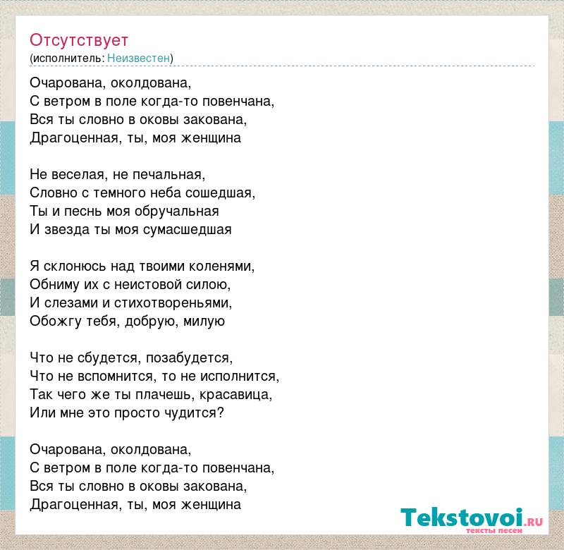 Очарована, околдована, С ветром в поле когда-то повенчана, Вся ты словно в оковы закована, Драгоценная, ты, моя женщина Не веселая, не печальная, Словно с темного неба сошедшая, Ты и песнь моя обручальная И звезда ты моя сумасшедшая Я склонюсь над твоими коленями, Обниму их с неистовой силою, И слезами и стихотвореньями, Обожгу тебя, добрую, милую Что не сбудется, позабудется, Что не вспомнится, то не исполнится, Так чего же ты плачешь, красавица, Или мне это просто чудится? Очарована, околдована, С ветром в поле когда-то повенчана, Вся ты словно в оковы закована, Драгоценная, ты, моя женщина