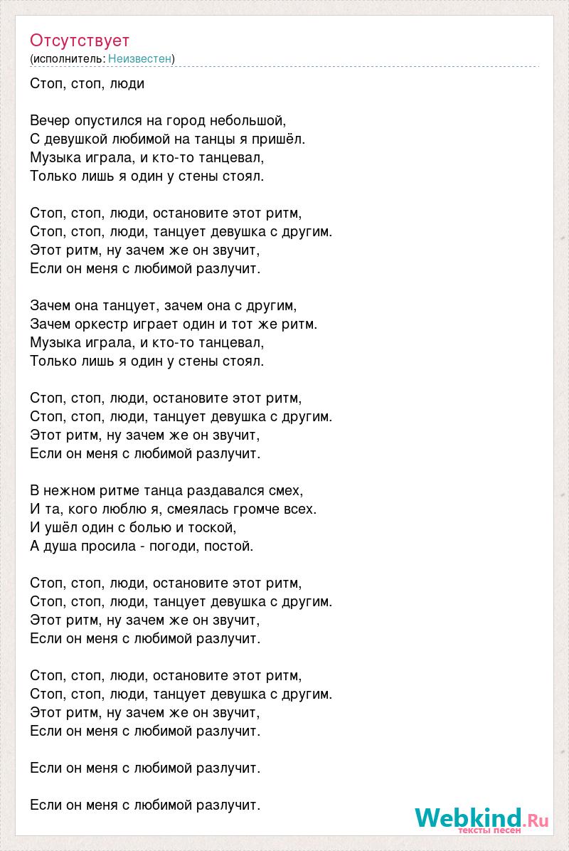 Стоп, стоп, люди Вечер опустился на город небольшой, С девушкой любимой на танцы я пришёл. Музыка играла, и кто-то танцевал, Только лишь я один у стены стоял. Стоп, стоп, люди, остановите этот ритм, Стоп, стоп, люди, танцует девушка с другим. Этот ритм, ну зачем же он звучит, Если он меня с любимой разлучит. Зачем она танцует, зачем она с другим, Зачем оркестр играет один и тот же ритм. Музыка играла, и кто-то танцевал, Только лишь я один у стены стоял. Стоп, стоп, люди, остановите этот ритм, Стоп, стоп, люди, танцует девушка с другим. Этот ритм, ну зачем же он звучит, Если он меня с любимой разлучит. В нежном ритме танца раздавался смех, И та, кого люблю я, смеялась громче всех. И ушёл один с болью и тоской, А душа просила - погоди, постой. Стоп, стоп, люди, остановите этот ритм, Стоп, стоп, люди, танцует девушка с другим. Этот ритм, ну зачем же он звучит, Если он меня с любимой разлучит. Стоп, стоп, люди, остановите этот ритм, Стоп, стоп, люди, танцует девушка с другим. Этот ритм, ну зачем же он звучит, Если он меня с любимой разлучит. Если он меня с любимой разлучит. Если он меня с любимой разлучит.