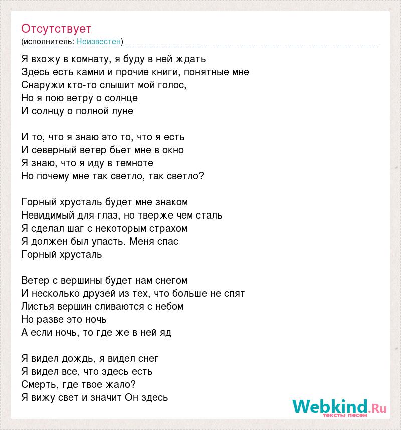 Я вхожу в комнату, я буду в ней ждать Здесь есть камни и прочие книги, понятные мне Снаружи кто-то слышит мой голос, Но я пою ветру о солнце И солнцу о полной луне И то, что я знаю это то, что я есть И северный ветер бьет мне в окно Я знаю, что я иду в темноте Но почему мне так светло, так светло? Горный хрусталь будет мне знаком Невидимый для глаз, но тверже чем сталь Я сделал шаг с некоторым страхом Я должен был упасть. Меня спас Горный хрусталь Ветер с вершины будет нам снегом И несколько друзей из тех, что больше не спят Листья вершин сливаются с небом Но разве это ночь А если ночь, то где же в ней яд Я видел дождь, я видел снег Я видел все, что здесь есть Смерть, где твое жало? Я вижу свет и значит Он здесь
