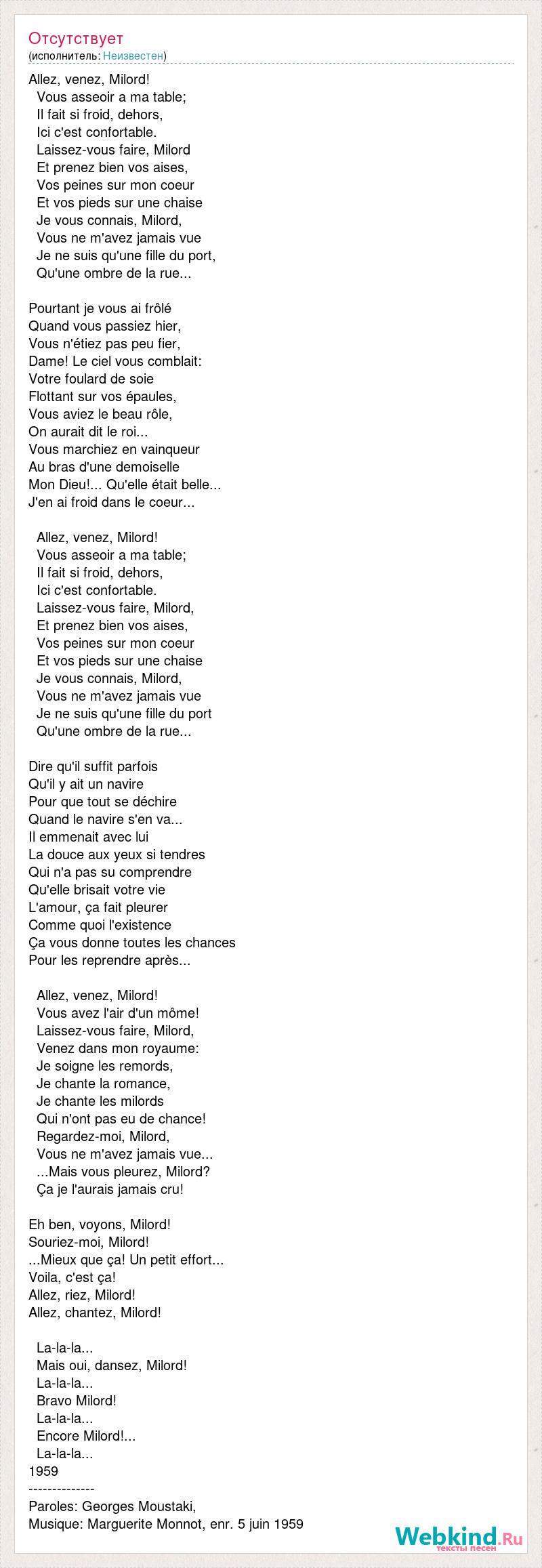 Allez, venez, Milord! Vous asseoir а ma table; Il fait si froid, dehors, Ici c'est confortable. Laissez-vous faire, Milord Et prenez bien vos aises, Vos peines sur mon coeur Et vos pieds sur une chaise Je vous connais, Milord, Vous ne m'avez jamais vue Je ne suis qu'une fille du port, Qu'une ombre de [bad word] .. Pourtant je vous ai frôlé Quand vous passiez hier, Vous n'étiez pas peu fier, Dame! Le ciel [bad word] Votre foulard de soie Flottant sur vos épaules, Vous aviez le beau rôle, On aurait dit le roi... Vous marchiez en vainqueur Au bras d'une demoiselle Mon Dieu!... Qu'elle était belle... J'en ai froid dans le coeur... Allez, venez, Milord! Vous asseoir а ma table; Il fait si froid, dehors, Ici c'est confortable. Laissez-vous faire, Milord, Et prenez bien vos aises, Vos peines sur mon coeur Et vos pieds sur une chaise Je vous connais, Milord, Vous ne m'avez jamais vue Je ne suis qu'une fille du port Qu'une ombre de [bad word] .. Dire qu'il suffit parfois Qu'il y ait un navire Pour que tout se déchire Quand le navire s'en va... Il emmenait avec lui La douce aux yeux si tendres Qui n'a pas [bad word] Qu'elle brisait votre vie L'amour, ça fait pleurer [bad word] quoi l'existence Ça vous donne toutes les chances Pour les reprendre après... Allez, venez, Milord! Vous avez l'air d'un môme! Laissez-vous faire, Milord, Venez dans mon royaume: Je soigne les remords, Je chante la romance, Je chante les milords Qui n'ont pas eu de chance! Regardez-moi, Milord, Vous ne m'avez jamais vue... ...Mais vous pleurez, Milord? Ça je l'aurais jamais [bad word] #33; Eh ben, voyons, Milord! Souriez-moi, Milord! ...Mieux que ça! Un petit effort... Voilа, c'est ça! Allez, riez, Milord! Allez, chantez, Milord! La-la-la... Mais oui, dansez, Milord! La-la-la... Bravo Milord! La-la-la... Encore Milord!... La-la-la... 1959 -------------- Paroles: Georges Moustaki, Musique: Marguerite Monnot, enr. 5 juin 1959