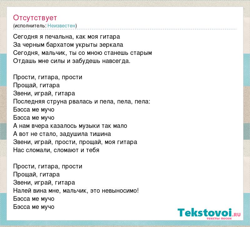 Сегодня я печальна, как моя гитара За черным бархатом укрыты зеркала Сегодня, мальчик, ты со мною станешь старым Отдашь мне силы и забудешь навсегда. Прости, гитара, прости Прощай, гитара Звени, играй, гитара Последняя струна рвалась и пела, пела, пела: Бэсса ме мучо Бэсса ме мучо А нам вчера казалось музыки так мало А вот не стало, задушила тишина Звени, играй, прости, прощай, моя гитара Нас сломали, сломают и тебя Прости, гитара, прости Прощай, гитара Звени, играй, гитара Налей вина мне, мальчик, это невыносимо! Бэсса ме мучо Бэсса ме мучо