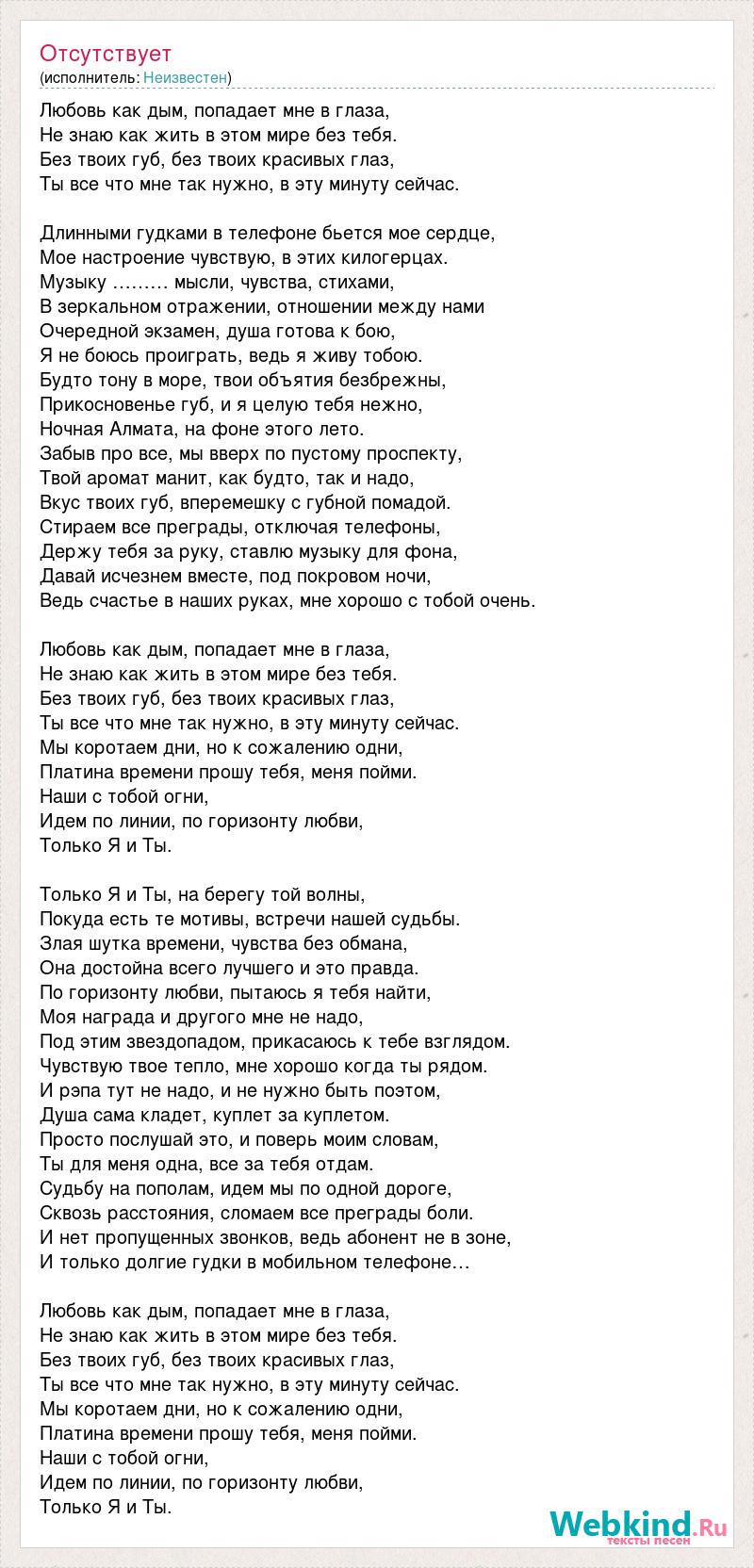 Любовь как дым, попадает мне в глаза, Не знаю как жить в этом мире без тебя. Без твоих губ, без твоих красивых глаз, Ты все что мне так нужно, в эту минуту сейчас. Длинными гудками в телефоне бьется мое сердце, Мое настроение чувствую, в этих килогерцах. Музыку ……… мысли, чувства, стихами, В зеркальном отражении, отношении между нами Очередной экзамен, душа готова к бою, Я не боюсь проиграть, ведь я живу тобою. Будто тону в море, твои объятия безбрежны, Прикосновенье губ, и я целую тебя нежно, Ночная Алмата, на фоне этого лето. Забыв про все, мы вверх по пустому проспекту, Твой аромат манит, как будто, так и надо, Вкус твоих губ, вперемешку с губной помадой. Стираем все преграды, отключая телефоны, Держу тебя за руку, ставлю музыку для фона, Давай исчезнем вместе, под покровом ночи, Ведь счастье в наших руках, мне хорошо с тобой очень. Любовь как дым, попадает мне в глаза, Не знаю как жить в этом мире без тебя. Без твоих губ, без твоих красивых глаз, Ты все что мне так нужно, в эту минуту сейчас. Мы коротаем дни, но к сожалению одни, Платина времени прошу тебя, меня пойми. Наши с тобой огни, Идем по линии, по горизонту любви, Только Я и Ты. Только Я и Ты, на берегу той волны, Покуда есть те мотивы, встречи нашей судьбы. Злая шутка времени, чувства без обмана, Она достойна всего лучшего и это правда. По горизонту любви, пытаюсь я тебя найти, Моя награда и другого мне не надо, Под этим звездопадом, прикасаюсь к тебе взглядом. Чувствую твое тепло, мне хорошо когда ты рядом. И рэпа тут не надо, и не нужно быть поэтом, Душа сама кладет, куплет за куплетом. Просто послушай это, и поверь моим словам, Ты для меня одна, все за тебя отдам. Судьбу на пополам, идем мы по одной дороге, Сквозь расстояния, сломаем все преграды боли. И нет пропущенных звонков, ведь абонент не в зоне, И только долгие гудки в мобильном телефоне… Любовь как дым, попадает мне в глаза, Не знаю как жить в этом мире без тебя. Без твоих губ, без твоих красивых глаз, Ты все что мне так нужно, в эту минуту сейчас. Мы коротаем дни, но к сожалению одни, Платина времени прошу тебя, меня пойми. Наши с тобой огни, Идем по линии, по горизонту любви, Только Я и Ты.