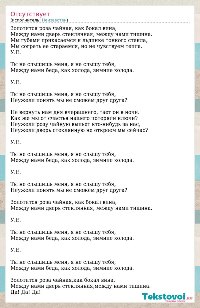 Золотится роза чайная, как бокал вина, Между нами дверь стеклянная, между нами тишина. Мы губами прикасаемся к льдинке тонкого стекла, Мы согреть ее стараемся, но не чувствуем тепла. У.Е. Ты не слышишь меня, я не слышу тебя, Между нами беда, как холода, зимние холода. У.Е. Ты не слышишь меня, я не слышу тебя, Неужели понять мы не сможем друг друга? Не вернуть нам дня вчерашнего, тает он в ночи. Как же мы от счастья нашего потеряли ключи? Неужели розу чайную выпьет кто-нибудь за нас, Неужели дверь стеклянную не откроем мы сейчас? У.Е. Ты не слышишь меня, я не слышу тебя, Между нами беда, как холода, зимние холода. У.Е. Ты не слышишь меня, я не слышу тебя, Неужели понять мы не сможем друг друга? Золотится роза чайная, как бокал вина, Между нами дверь стеклянная, между нами тишина. У.Е. Ты не слышишь меня, я не слышу тебя, Между нами беда, как холода, зимние холода. У.Е. Ты не слышишь меня, я не слышу тебя, Между нами беда, как холода, зимние холода. Золотится роза чайная,как бокал вина, Между нами дверь стеклянная,между нами тишина. Да! Да! Да!