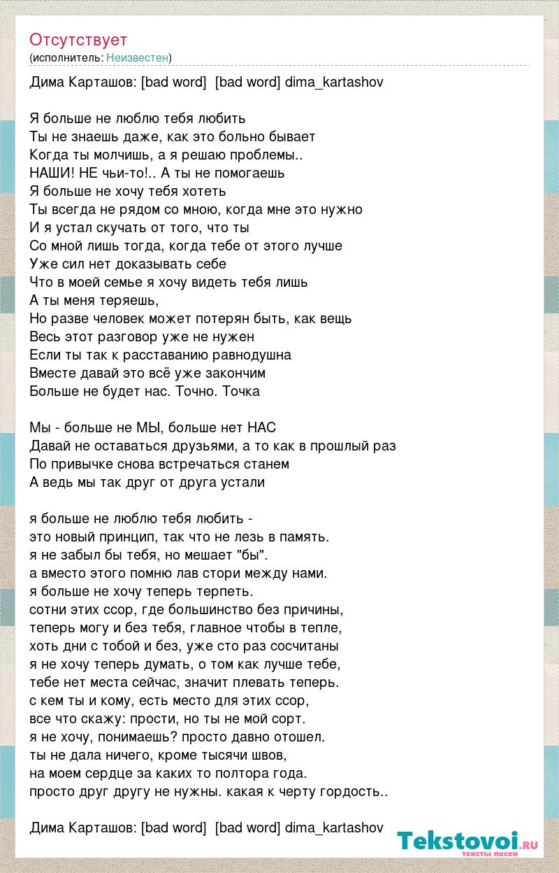 Дима Карташов: [bad word] [bad word] dima_kartashov Я больше не люблю тебя любить Ты не знаешь даже, как это больно бывает Когда ты молчишь, а я решаю проблемы.. НАШИ! НЕ чьи-то!.. А ты не помогаешь Я больше не хочу тебя хотеть Ты всегда не рядом со мною, когда мне это нужно И я устал скучать от того, что ты Со мной лишь тогда, когда тебе от этого лучше Уже сил нет доказывать себе Что в моей семье я хочу видеть тебя лишь А ты меня теряешь, Но разве человек может потерян быть, как вещь Весь этот разговор уже не нужен Если ты так к расставанию равнодушна Вместе давай это всё уже закончим Больше не будет нас. Точно. Точка Мы - больше не МЫ, больше нет НАС Давай не оставаться друзьями, а то как в прошлый раз По привычке снова встречаться станем А ведь мы так друг от друга устали я больше не люблю тебя любить - это новый принцип, так что не лезь в память. я не забыл бы тебя, но мешает "бы". а вместо этого помню лав стори между нами. я больше не хочу теперь терпеть. сотни этих ссор, где большинство без причины, теперь могу и без тебя, главное чтобы в тепле, хоть дни с тобой и без, уже сто раз сосчитаны я не хочу теперь думать, о том как лучше тебе, тебе нет места сейчас, значит плевать теперь. с кем ты и кому, есть место для этих ссор, все что скажу: прости, но ты не мой сорт. я не хочу, понимаешь? просто давно отошел. ты не дала ничего, кроме тысячи швов, на моем сердце за каких то полтора года. просто друг другу не нужны. какая к черту гордость.. Дима Карташов: [bad word] [bad word] dima_kartashov
