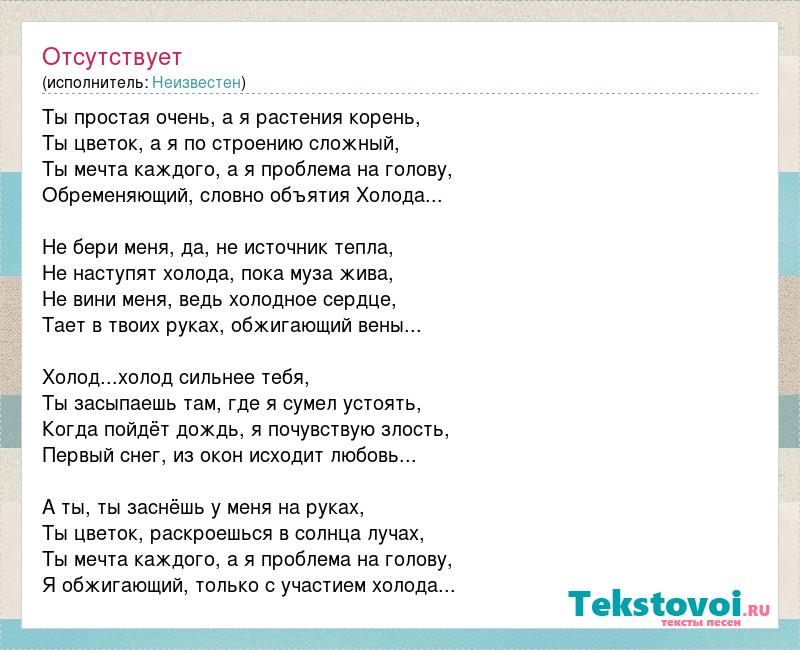 Ты простая очень, а я растения корень, Ты цветок, а я по строению сложный, Ты мечта каждого, а я проблема на голову, Обременяющий, словно объятия Холода... Не бери меня, да, не источник тепла, Не наступят холода, пока муза жива, Не вини меня, ведь холодное сердце, Тает в твоих руках, обжигающий вены... Холод...холод сильнее тебя, Ты засыпаешь там, где я сумел устоять, Когда пойдёт дождь, я почувствую злость, Первый снег, из окон исходит любовь... А ты, ты заснёшь у меня на руках, Ты цветок, раскроешься в солнца лучах, Ты мечта каждого, а я проблема на голову, Я обжигающий, только с участием холода...