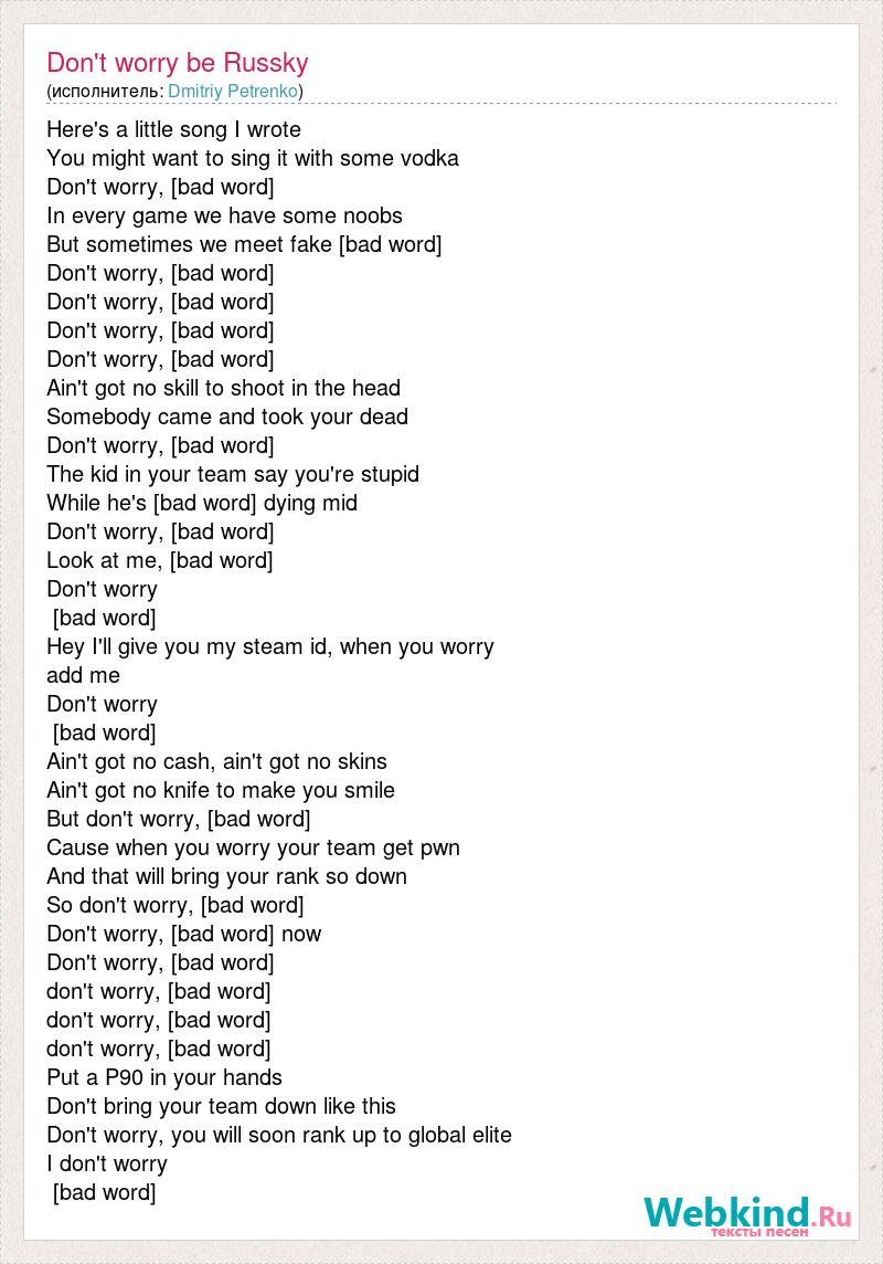 Here's a little song I wrote You might want to sing it with some vodka Don't worry, [bad word] In every game we have some noobs But sometimes we meet fake [bad word] Don't worry, [bad word] Don't worry, [bad word] Don't worry, [bad word] Don't worry, [bad word] Ain't got no skill to shoot in the head Somebody came and took your dead Don't worry, [bad word] The kid in your team say you're stupid While he's [bad word] dying mid Don't worry, [bad word] Look at me, [bad word] Don't worry [bad word] Hey I'll give you my steam id, when you worry add me Don't worry [bad word] Ain't got no cash, ain't got no skins Ain't got no knife to make you smile But don't worry, [bad word] Cause when you worry your team get pwn And that will bring your rank so down So don't worry, [bad word] Don't worry, [bad word] now Don't worry, [bad word] don't worry, [bad word] don't worry, [bad word] don't worry, [bad word] Put a P90 in your hands Don't bring your team down like this Don't worry, you will soon rank up to global elite I don't worry [bad word]