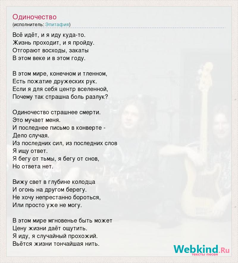 Всё идёт, и я иду куда-то. Жизнь проходит, и я пройду. Отгорают восходы, закаты В этом веке и в этом году. В этом мире, конечном и тленном, Есть пожатие дружеских рук. Если я для себя центр вселенной, Почему так страшна боль разлук? Одиночество страшнее смерти. Это мучает меня. И последнее письмо в конверте - Дело случая. Из последних сил, из последних слов Я ищу ответ. Я бегу от тьмы, я бегу от снов, Но ответа нет. Вижу свет в глубине колодца И огонь на другом берегу. Не хочу непрестанно бороться, Или просто уже не могу. В этом мире мгновенье быть может Цену жизни даёт ощутить. Я иду, я случайный прохожий. Вьётся жизни тончайшая нить.