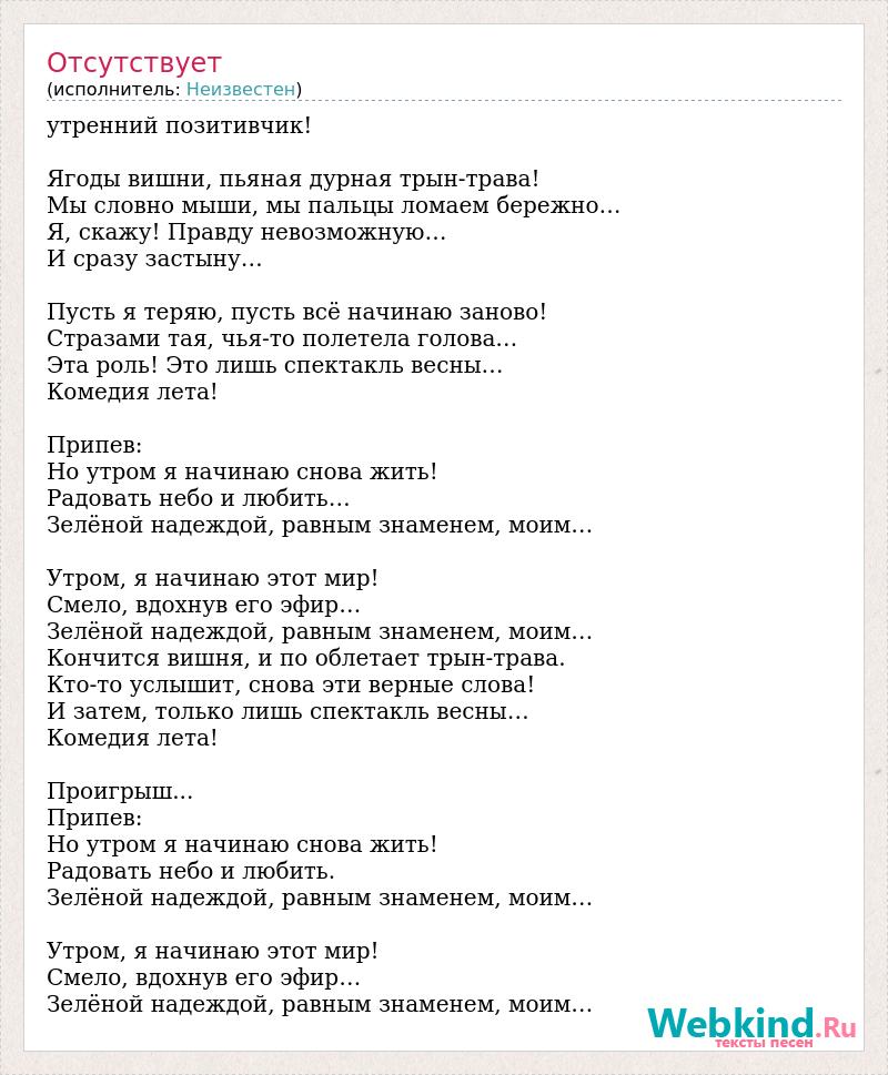 утренний позитивчик! Ягоды вишни, пьяная дурная трын-трава! Мы словно мыши, мы пальцы ломаем бережно… Я, скажу! Правду невозможную… И сразу застыну… Пусть я теряю, пусть всё начинаю заново! Стразами тая, чья-то полетела голова… Эта роль! Это лишь спектакль весны… Комедия лета! Припев: Но утром я начинаю снова жить! Радовать небо и любить… Зелёной надеждой, равным знаменем, моим… Утром, я начинаю этот мир! Смело, вдохнув его эфир… Зелёной надеждой, равным знаменем, моим… Кончится вишня, и по облетает трын-трава. Кто-то услышит, снова эти верные слова! И затем, только лишь спектакль весны… Комедия лета! Проигрыш... Припев: Но утром я начинаю снова жить! Радовать небо и любить. Зелёной надеждой, равным знаменем, моим… Утром, я начинаю этот мир! Смело, вдохнув его эфир… Зелёной надеждой, равным знаменем, моим…