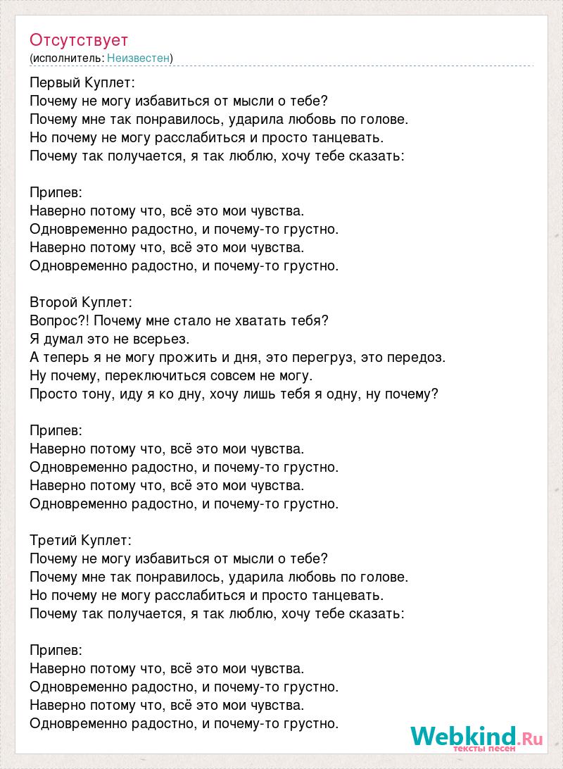 Первый Куплет: Почему не могу избавиться от мысли о тебе? Почему мне так понравилось, ударила любовь по голове. Но почему не могу расслабиться и просто танцевать. Почему так получается, я так люблю, хочу тебе сказать: Припев: Наверно потому что, всё это мои чувства. Одновременно радостно, и почему-то грустно. Наверно потому что, всё это мои чувства. Одновременно радостно, и почему-то грустно. Второй Куплет: Вопрос?! Почему мне стало не хватать тебя? Я думал это не всерьез. А теперь я не могу прожить и дня, это перегруз, это передоз. Ну почему, переключиться совсем не могу. Просто тону, иду я ко дну, хочу лишь тебя я одну, ну почему? Припев: Наверно потому что, всё это мои чувства. Одновременно радостно, и почему-то грустно. Наверно потому что, всё это мои чувства. Одновременно радостно, и почему-то грустно. Третий Куплет: Почему не могу избавиться от мысли о тебе? Почему мне так понравилось, ударила любовь по голове. Но почему не могу расслабиться и просто танцевать. Почему так получается, я так люблю, хочу тебе сказать: Припев: Наверно потому что, всё это мои чувства. Одновременно радостно, и почему-то грустно. Наверно потому что, всё это мои чувства. Одновременно радостно, и почему-то грустно.