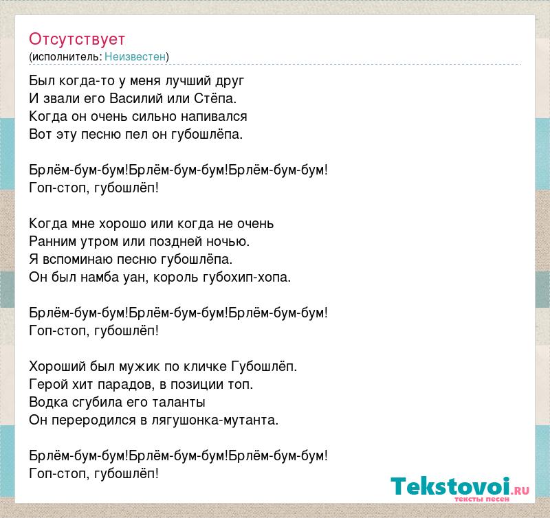 Был когда-то у меня лучший друг И звали его Василий или Стёпа. Когда он очень сильно напивался Вот эту песню пел он губошлёпа. Брлём-бум-бум!Брлём-бум-бум!Брлём-бум-бум! Гоп-стоп, губошлёп! Когда мне хорошо или когда не очень Ранним утром или поздней ночью. Я вспоминаю песню губошлёпа. Он был намба уан, король губохип-хопа. Брлём-бум-бум!Брлём-бум-бум!Брлём-бум-бум! Гоп-стоп, губошлёп! Хороший был мужик по кличке Губошлёп. Герой хит парадов, в позиции топ. Водка сгубила его таланты Он переродился в лягушонка-мутанта. Брлём-бум-бум!Брлём-бум-бум!Брлём-бум-бум! Гоп-стоп, губошлёп!