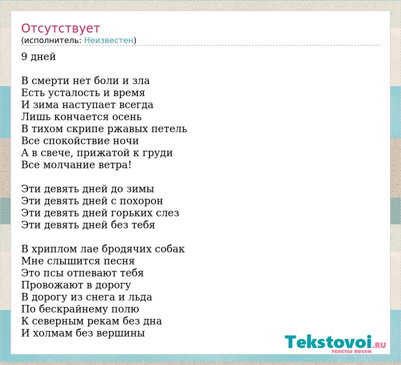 9 дней В смерти нет боли и зла Есть усталость и время И зима наступает всегда Лишь кончается осень В тихом скрипе ржавых петель Все спокойствие ночи А в свече, прижатой к груди Все молчание ветра! Эти девять дней до зимы Эти девять дней с похорон Эти девять дней горьких слез Эти девять дней без тебя В хриплом лае бродячих собак Мне слышится песня Это псы отпевают тебя Провожают в дорогу В дорогу из снега и льда По бескрайнему полю К северным рекам без дна И холмам без вершины
